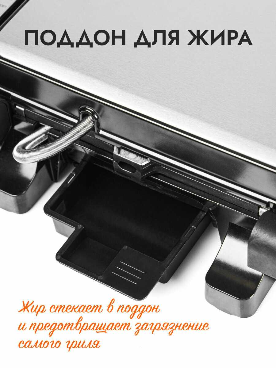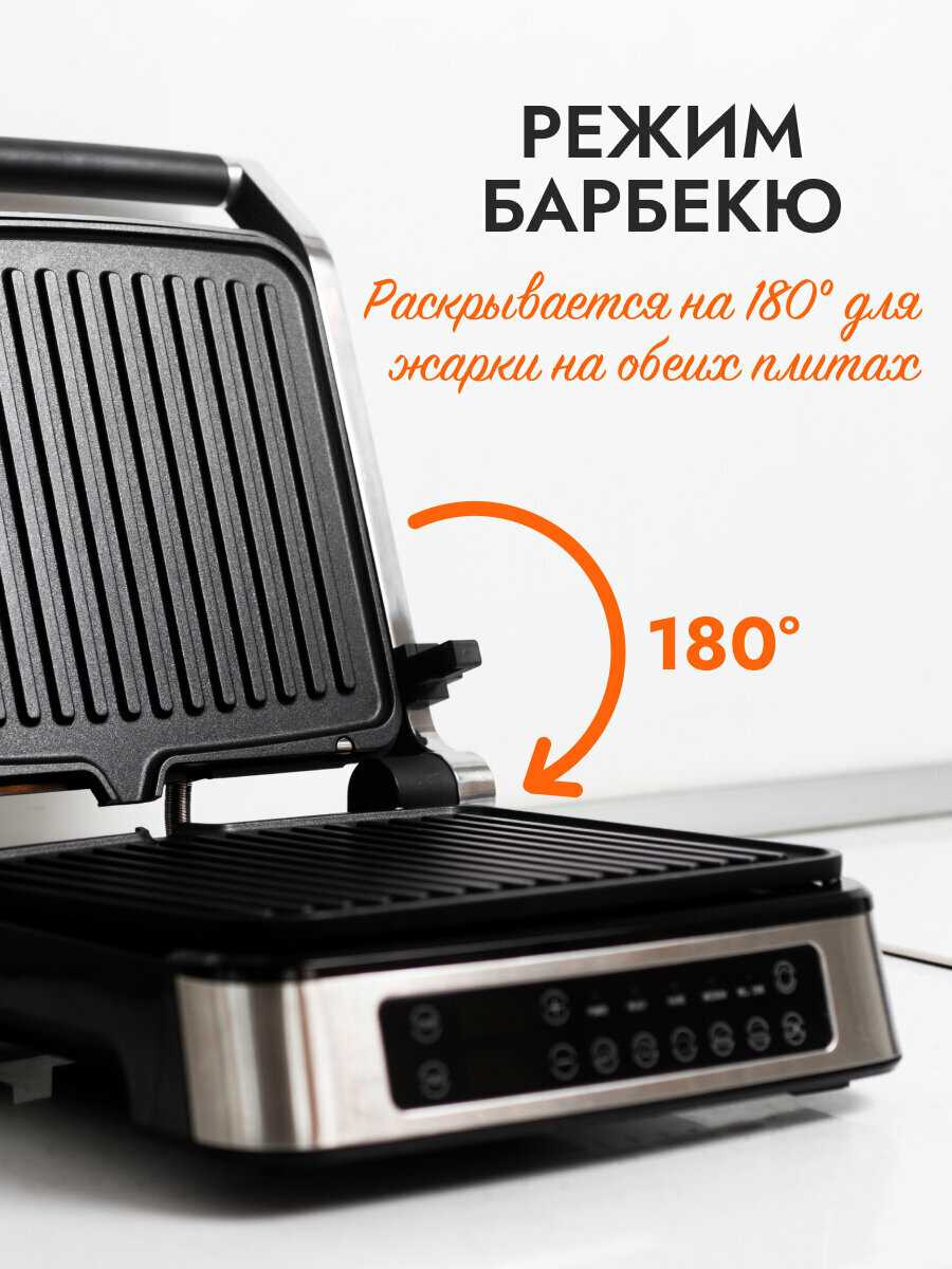 При полном раскрытии гриль трансформируется в две независимые рабочие поверхности, позволяя одновременно готовить разные блюда (например, мясо и овощи). Эта функция ускоряет процесс в 2 раза и идеальна для приготовления шаурмы, бургеров или комплексных завтраков. Отсек для сбора жира предотвращает разбрызгивание. -