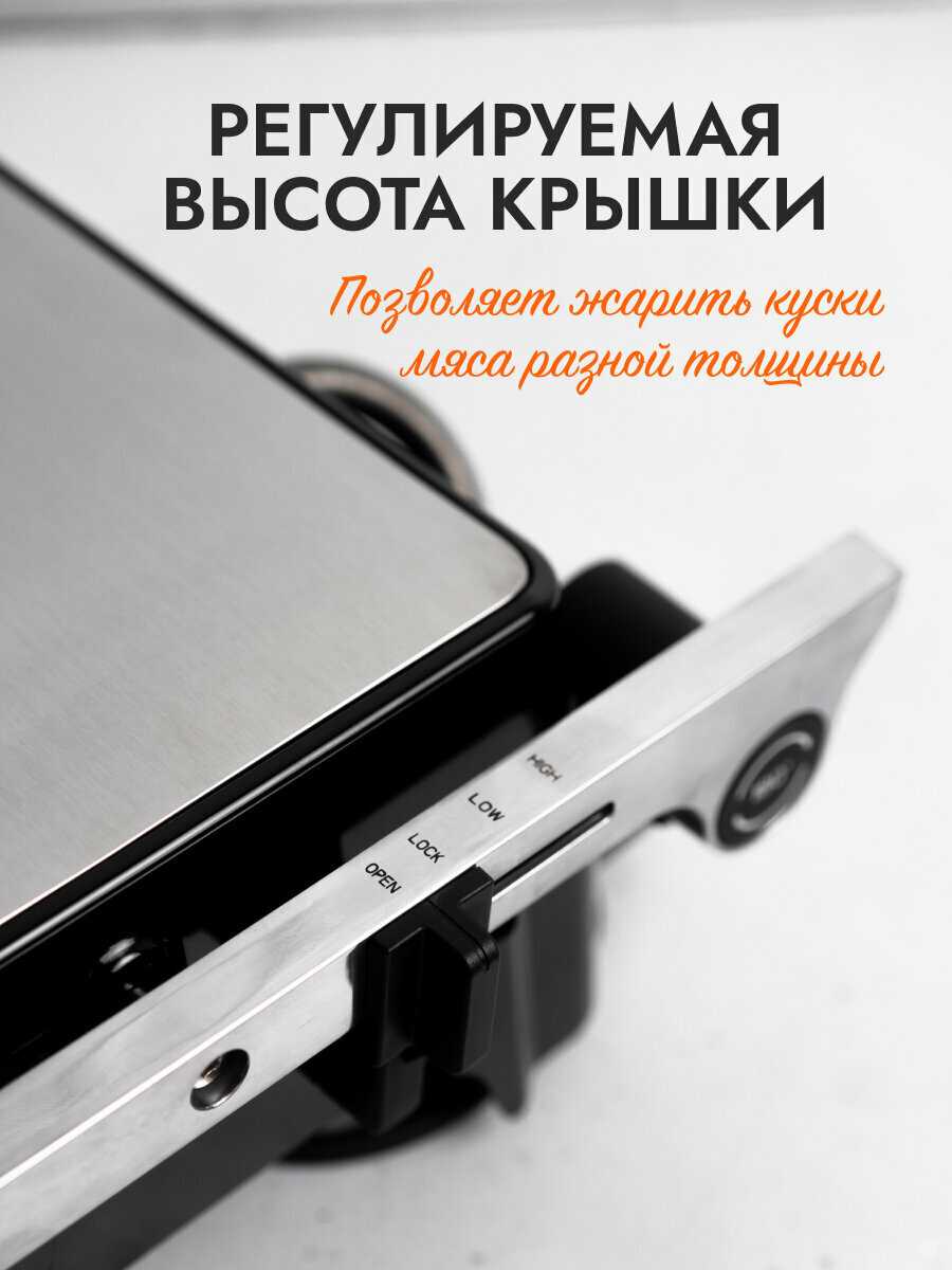Регулируемый механизм высоты позволяет готовить продукты толщиной до 5 см (например, свиную шейку). Однако излишнее давление на крышку может нарушить фиксацию. Оптимальный вес одной порции – до 1.5 кг для равномерного прогрева. -