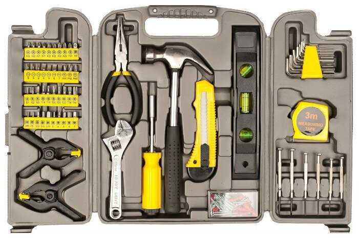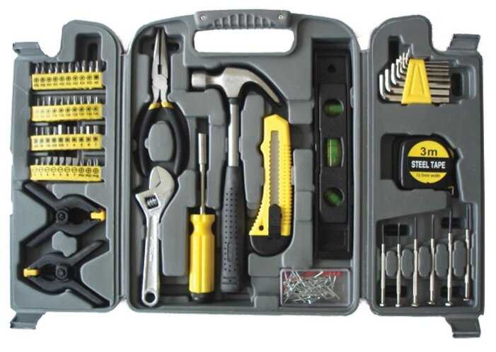 Инструменты в комплекте : | длинногубцы, ключ разводной, ключи гаечные, ключи имбусовые (шестигранные), молоток, отвёртки, отвёртки для точных работ, струбцина, тонкогубцы |