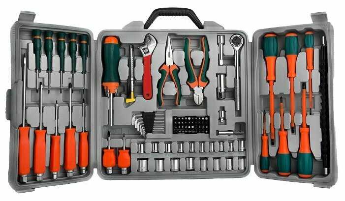 - + Удобный кейс для подвеса на стену, неплохое сочетание инструмента. Главный "гвоздь" набора - отвертка с битами, фонариком и магнитной антенной для доставания этих бит из щелей.