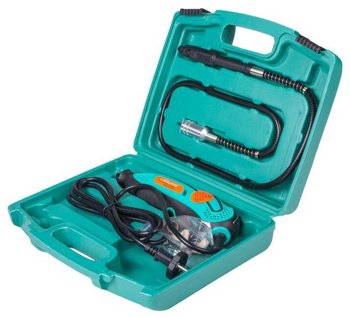 - Доступная стоимость при комплектации кейсом, валом и насадками делает модель выгодной альтернативой брендам типа Dremel.