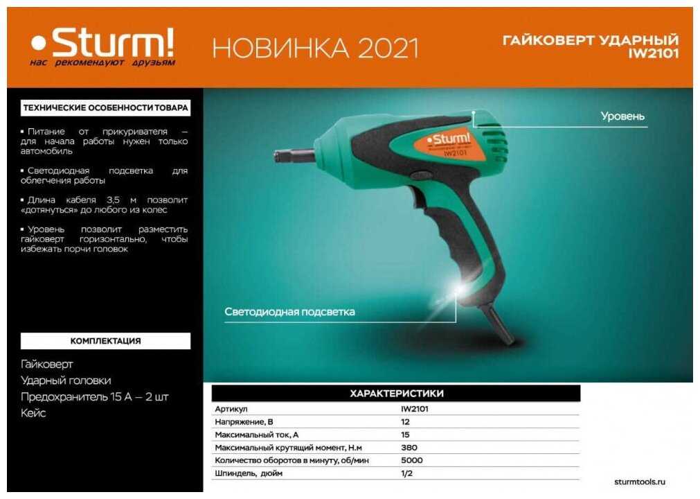 - + Купил недавно. месяца 2 назад. Привлекло то, что он работает от прикуривателя в автомобиле, доступная цена. Был удивлен, но гайковерт Sturm единственный кто это сделал.