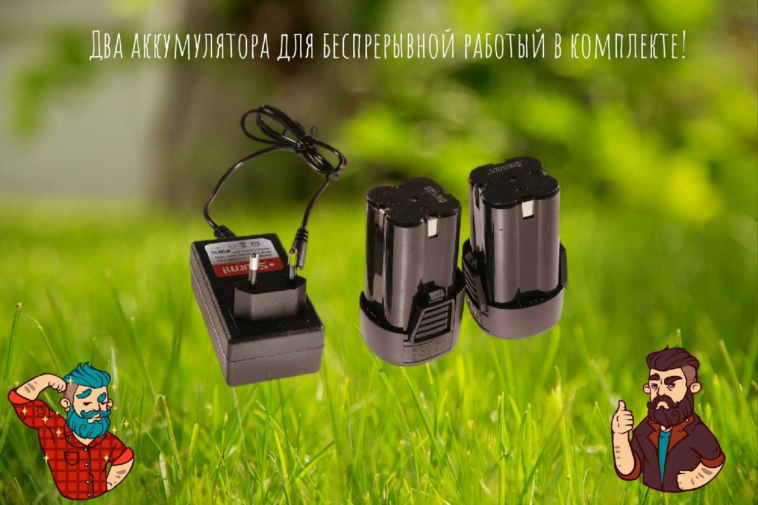 - Комплектация двумя аккумуляторами и продолжительность работы: