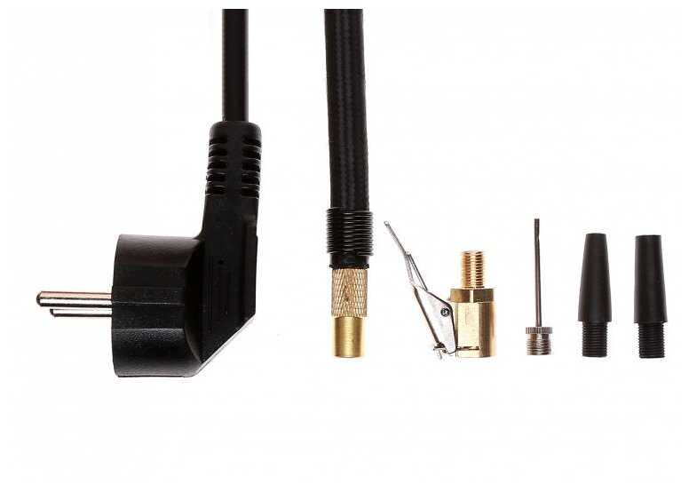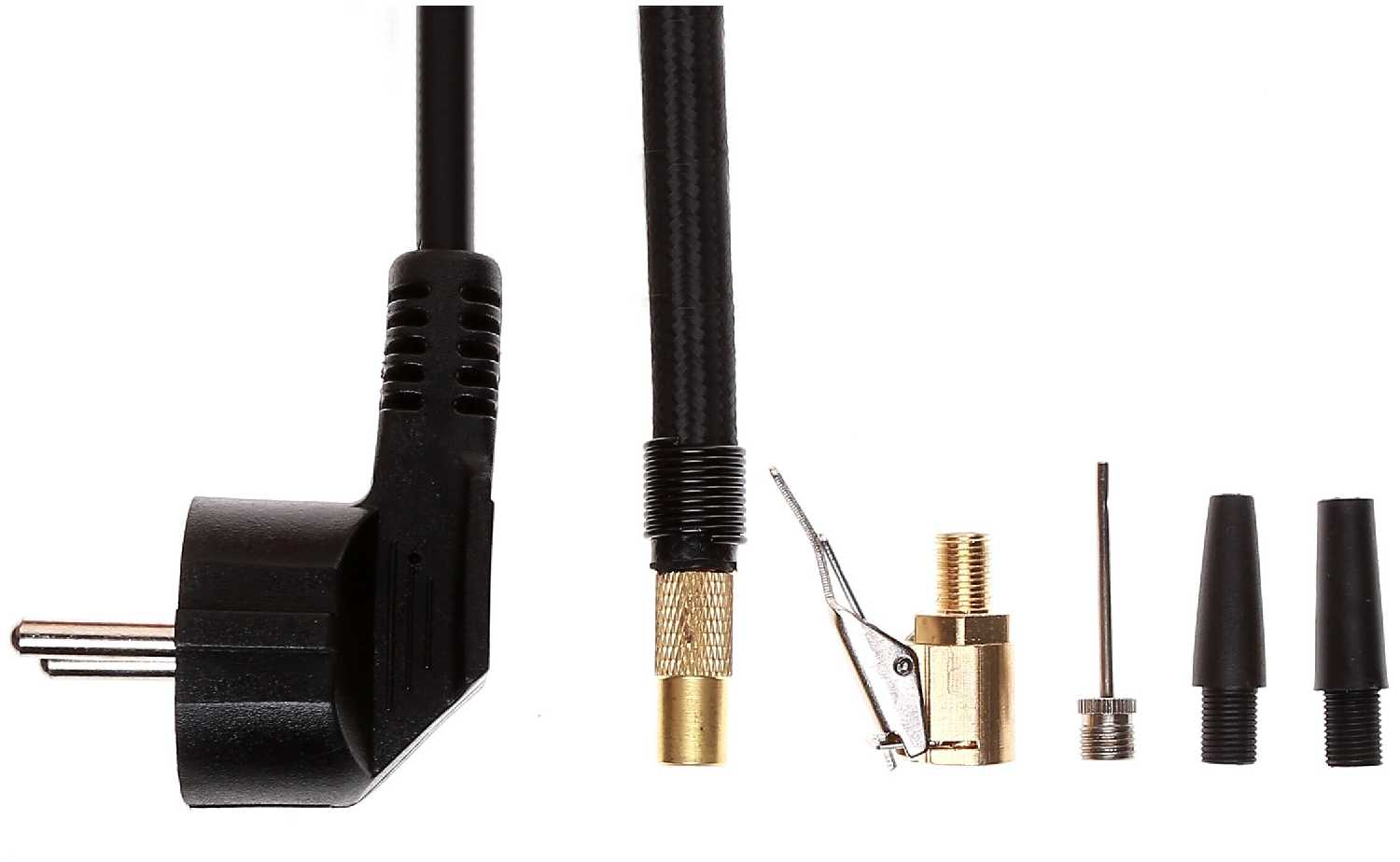 В комплект входит сам компрессор, толстый и на вид качественный шланг, провод питания, две пластмассовые насадки с резьбой и сумка для хранения. Пользователи отмечают, что сумка имеет невысокое качество исполнения и в ней нет отдельных карманов для аксессуаров. Конусные насадки могут плохо держаться и вылетать от напора воздуха. -