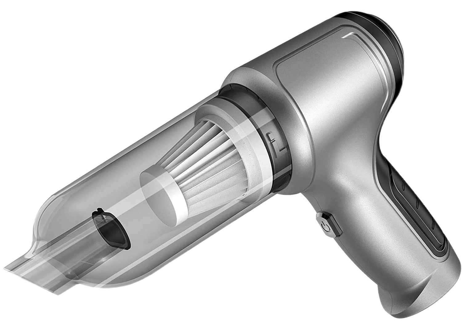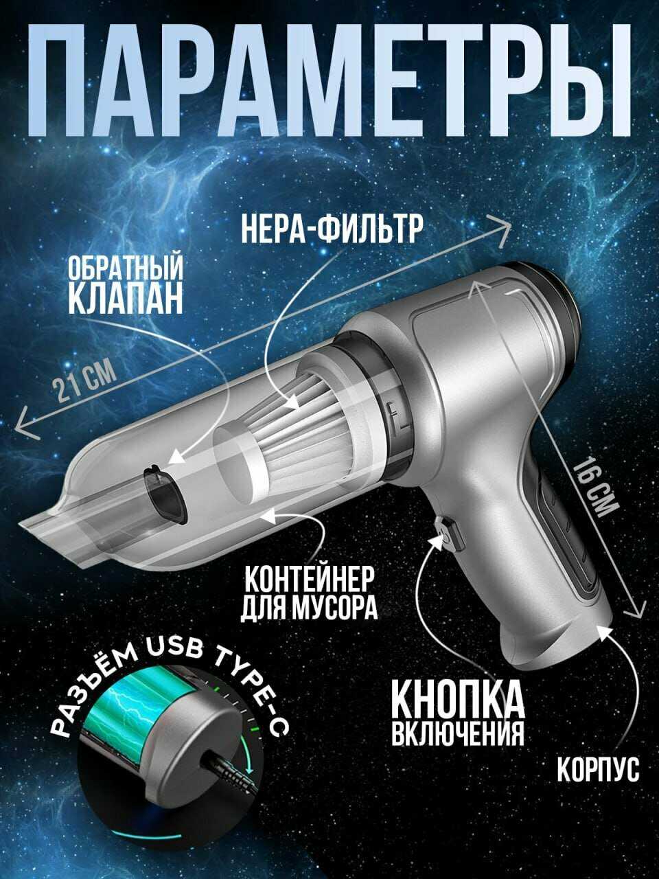 Пылесос действительно миниатюрный — многие пользователи сравнивают его размер с феном, а водители отмечают, что он легко помещается в автомобильный бардачок. Его компактность позволяет убирать в узких щелях между сиденьями машины или труднодоступных местах домашней техники. При этом корпус остаётся удобным для удержания одной рукой во время работы. -