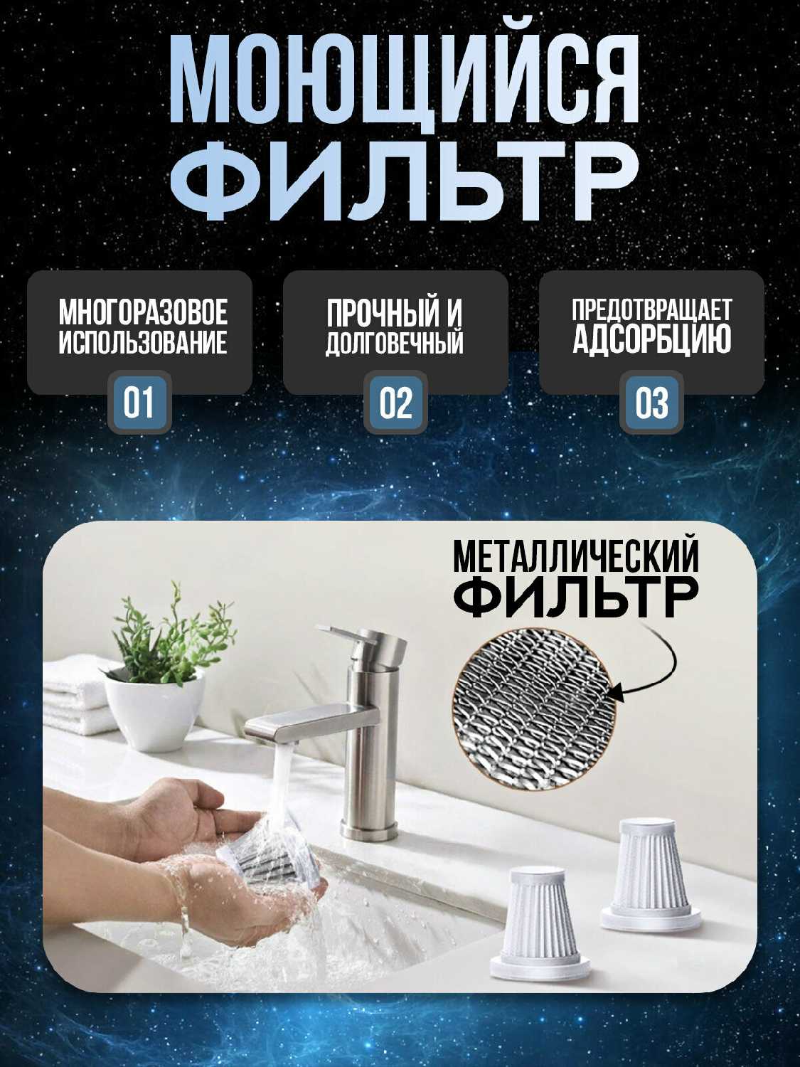 - Фильтры (включая запасной в комплекте) моются под водой, что продлевает срок службы.