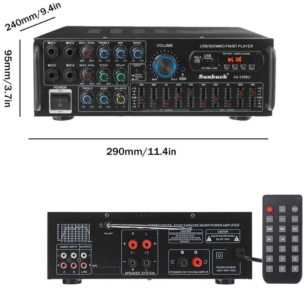 На прилагаемом фото изображены абсолютно новый усилитель Sunbuck AS-336BU c родной упаковкой и подключенные к нему легендарные JVC, крошечные колонки, каждая из которых умещается на ладони. На обратной стороне колонок надпись "потребляемая мощность макс. 20 Вт". Диаметр диффузора 7 см, сопротивление 4 ома. Эквалайзер на усилителе все ползунки вверх, бас на максимум. На 30-35% от максимальной громкости уже хрипит. Т.е. усилитель не вывозит даже такие малютки. Переводим регулятор баса в -10, ползунок 100 в -12 и, о, чудо - динамики орут так что уши режет и боязно за их сохранность. Но кому нужен такой звук? Полифонию проигрывать? И смысл в этой пафосной коробочке с надписью "Professional digital stereo mixer power amplifier"?