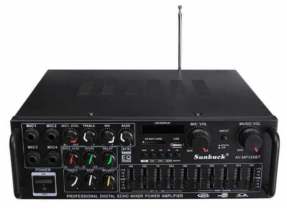 - + Усилитель выдает мощный отчетливый звук. Внешний вид - отличный, внушительный. Куча ручек, эквалайзер, функция караоке с балансировкой 4 микрофонов, тембрами, эхом и задержкой - все как надо. Проверено с радиомикрофоном WM-3309. Минусовая фонограмма легко подается через bluetooth. Винил, mp3, FM - звучат прекрасно. Особенно порадовал звук с винила.
