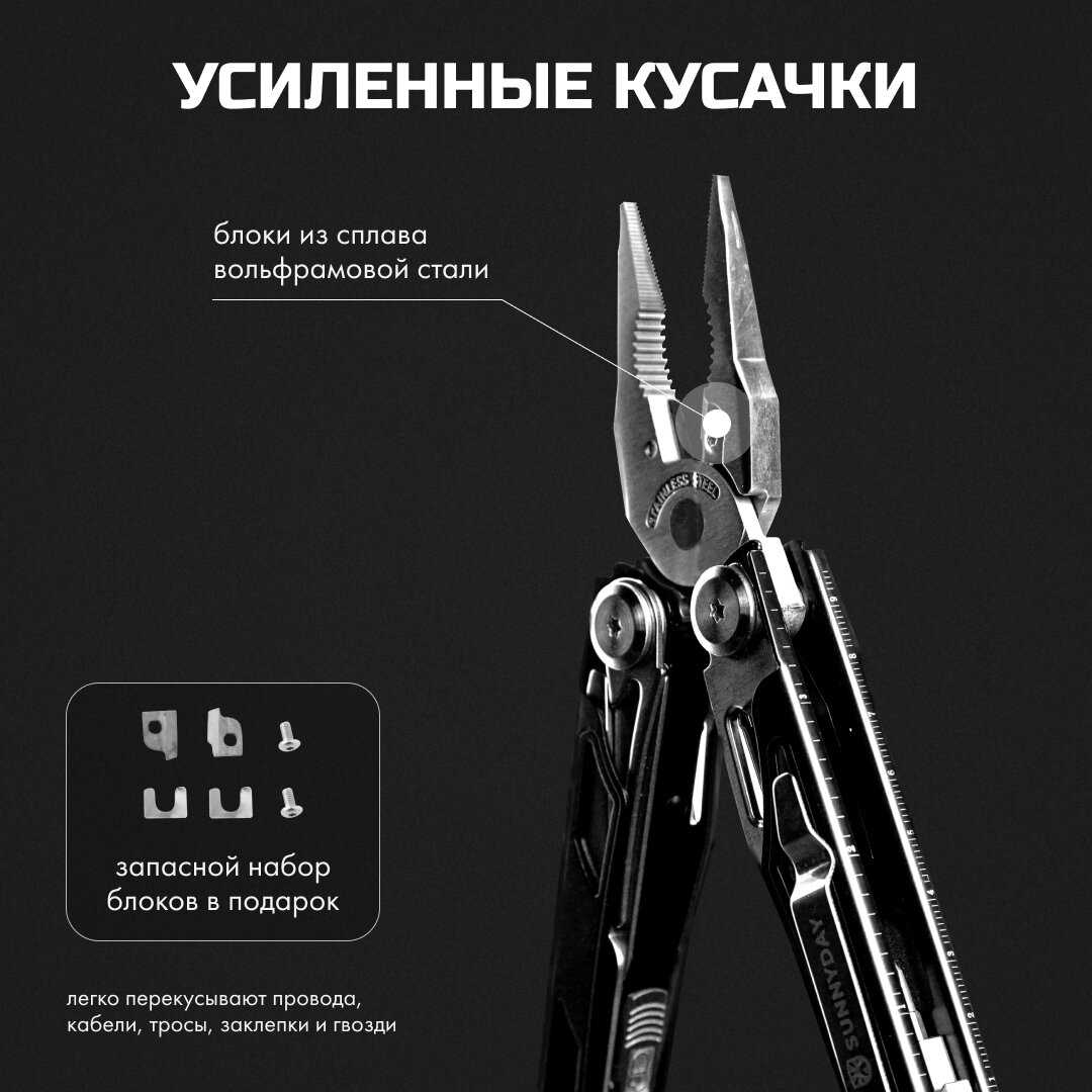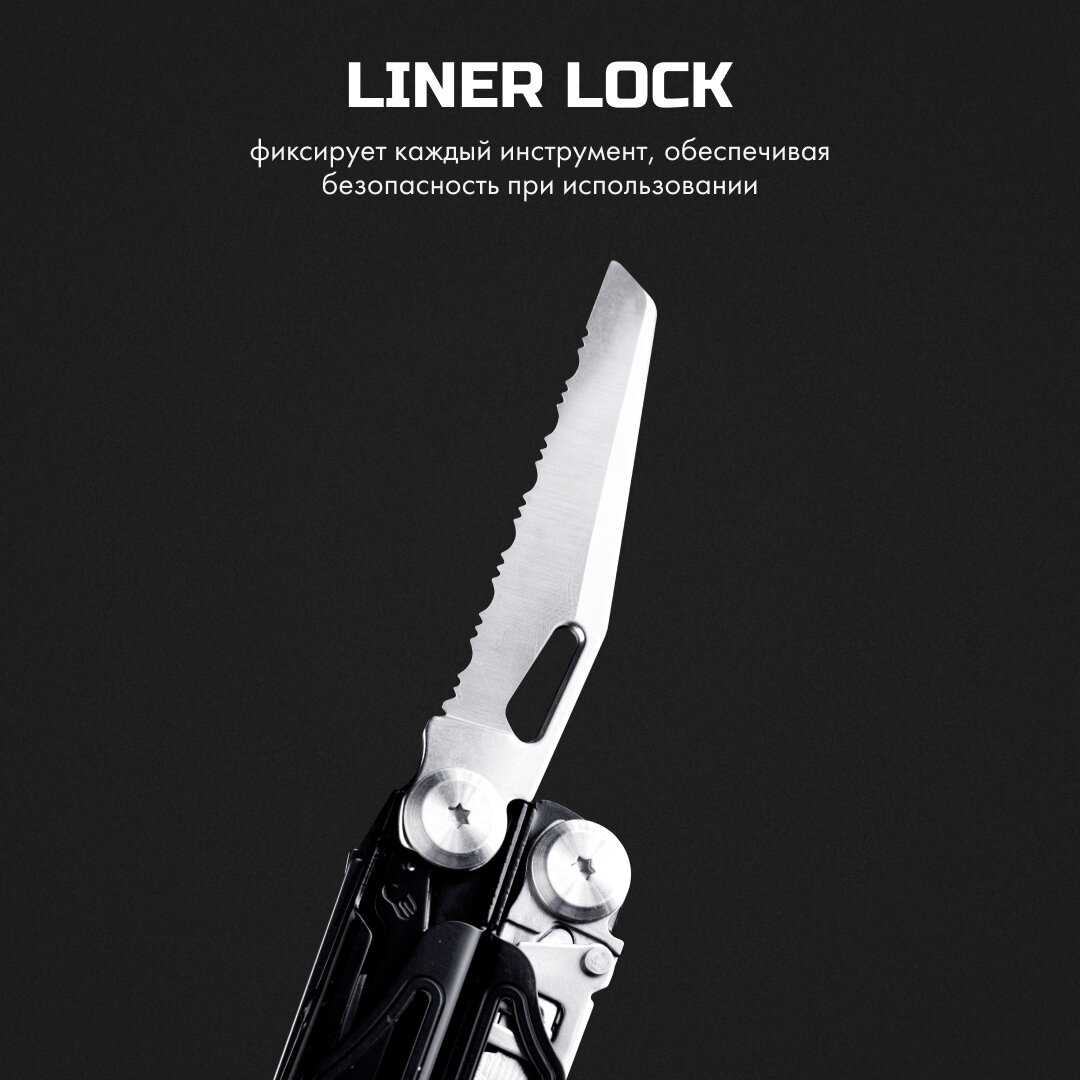 | Инструменты (функции) : | винтовая отвёртка, захват для гаек, клипса, консервный нож, кусачки, линейка, напильник, нож, острогубцы, отвертка, пассатижи, пила, плоскогубцы, сменные биты, шило / кернер |