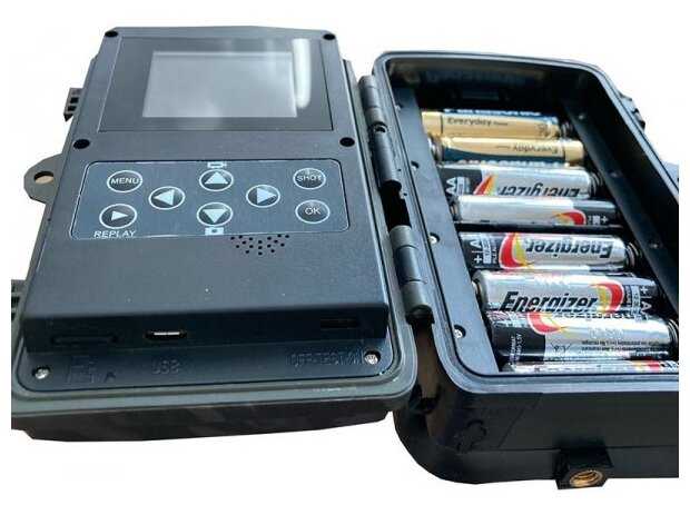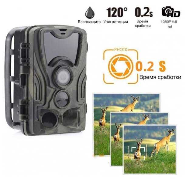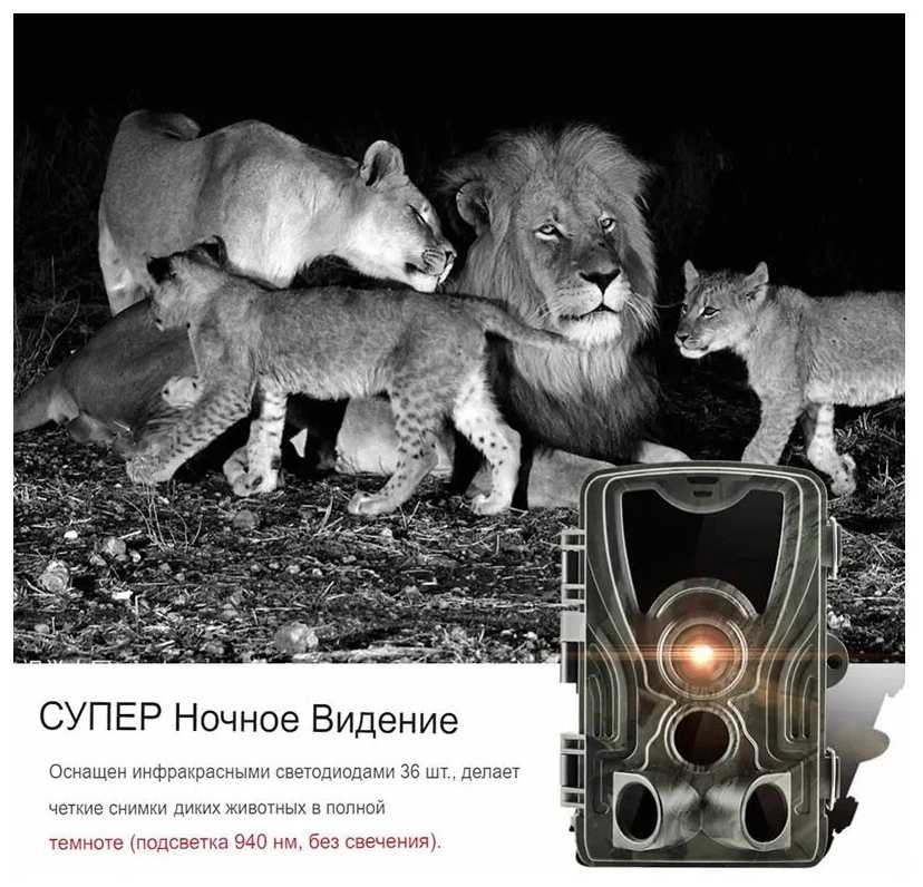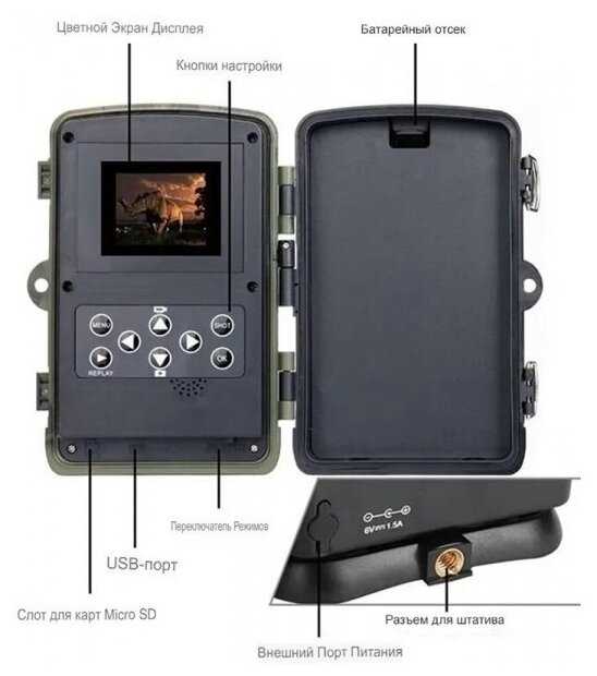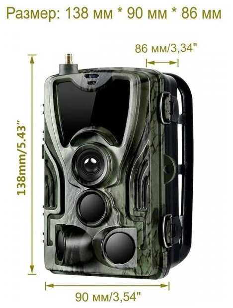 PIR Дальность обнаружения в темноте: до 20 метров, ИК Подсветка: 36 диодов (940 нм – невидимая), Дисплей: 2" ЖК, Память (не входит в комплект): microSD-карта до 32 Гб макс 10 класс, Разрешение изображения: 24MP=7096x3760 20МР=6048х3384 16MP=5360х3200 12МР=4032x3024 8MP=3264x2448, Разрешение видео: 1080P (30fps) 720P (30fps), PIR Чувствительность: до 20 метров регулируемая (высокая / нормальная / низкая), Время срабатывания: 0.2 секунды, Работа / Температура хранения: -40 - +70 ° C, Интервал съемки: 1 сек - 30 мин, Режим timelapse: 5 мин 30 мин 60 мин, Серия фото: 1-3-6-9 шт., Продолжительность видео: 10 - 90 сек, Питание: 8хАА или DC 6V (в комплект не входит), Потребляемый ток: 150мА, Сигнал низкого заряда батареи: световой индикатор индикация на дисплее, Запись звука: да, Монтаж: пояс Python замок, Размеры: 135x90x76 мм без антенны, Вес: 400 гр, Допустимая влажность использования: 5% - 90%.