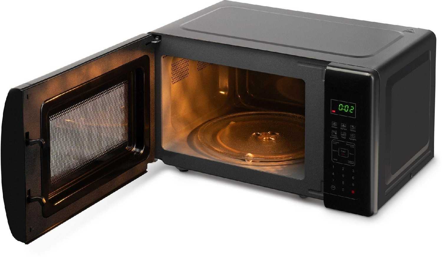 Конструкция и эргономика Компактные габариты (45-49 см в ширину) позволяют разместить устройство на ограниченном пространстве малогабаритных кухонь или общежитий, а эргономичная ручка обеспечивает легкое открывание дверцы, хотя у отдельных экземпляров наблюдается тугой ход или необходимость приложения усилия для плотного закрывания. Прочное эмалевое покрытие внутренней камеры устойчиво к царапинам и упрощает удаление жировых загрязнений, тогда как черный глянцевый корпус требует частой протирки из-за видимости отпечатков пальцев и пыли. Дисплей с часами и подсветкой сохраняет активную индикацию после завершения работы до принудительного закрытия дверцы, а короткий сетевой шнур ограничивает варианты установки. Механизм поворотного стола демонстрирует стабильную работу без смещения посуды, но при длительной эксплуатации возможны посторонние шумы, указывающие на износ компонентов.