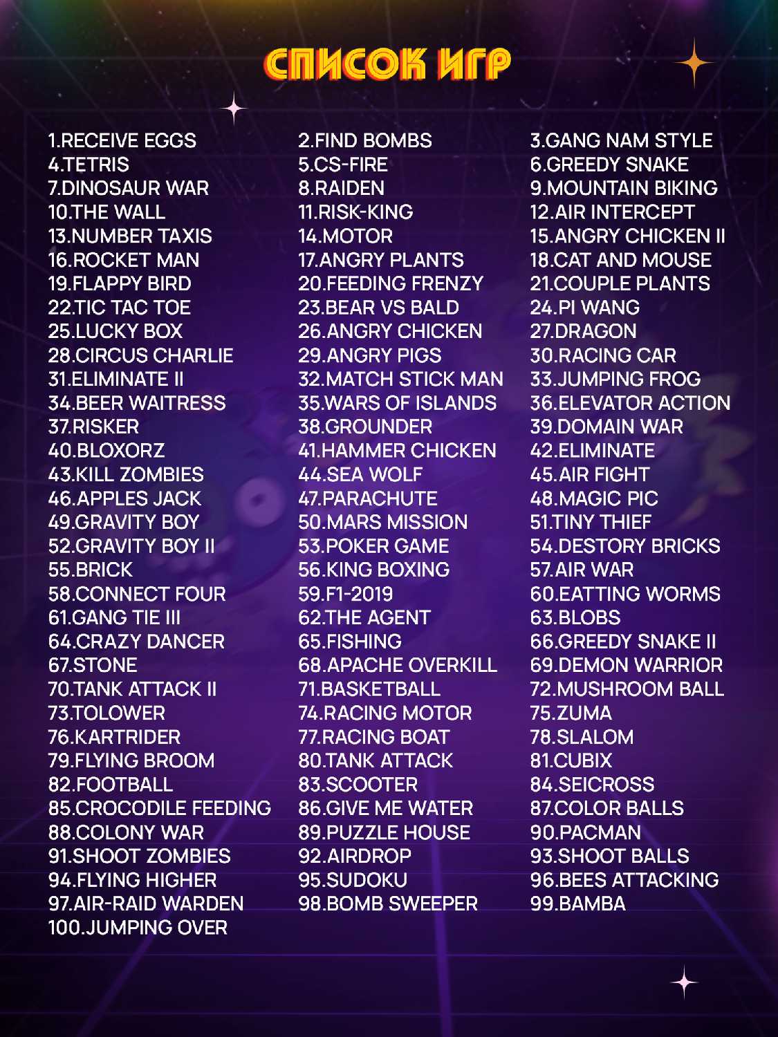 - - По классике часть игр повторяется, но с разными спрайтами. Экран, конечно, не Анберник. Выключение звука сбрасывается при нажатии на ресет. Музыка не восемь бит ни разу, мидишка.