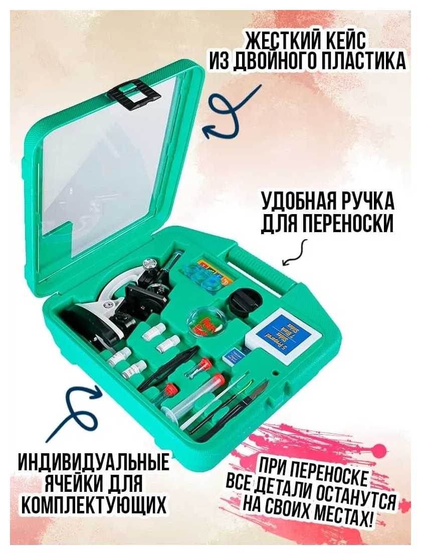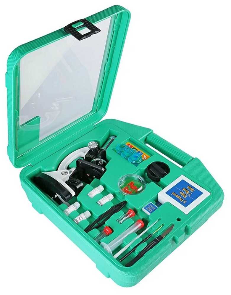 | Подробная комплектация : | микроскоп 300x-1200x, скальпель, игла, мешалка, цилиндр с делениями, пробирки для сбора 2шт, щипцы, покровное стекло (круглое) 7шт, покровное стекло (квадратное) 7шт, микропрепараты 5шт, предметное стекло 7шт, запасная лампа, нож для резки препаратов, чашка Петри, субстрат смолы, краситель гематоксилин, морская соль, икра морских рачков (артемии), инкубатор для артемии, практическое руководство по проведению опытов, кейс |