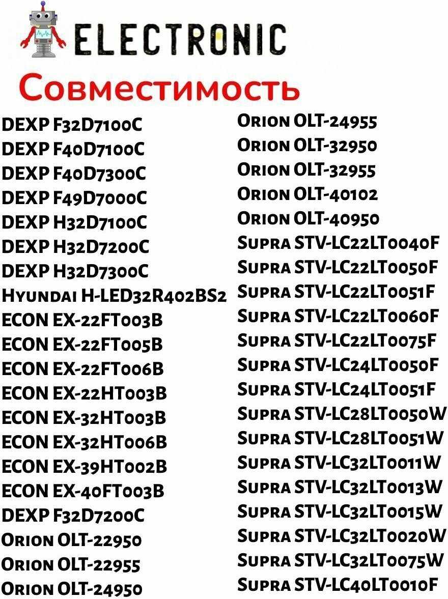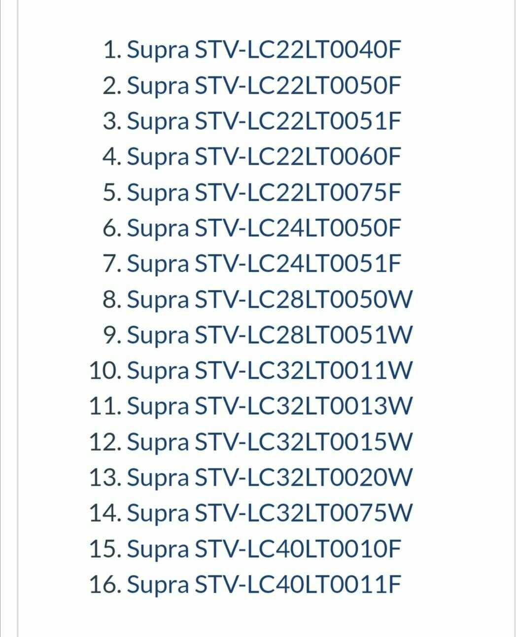 Совместимые модели : | SUPRA STV-LC22LT0075F, SUPRA STV-LC24LT0051F, SUPRA STV-LC28LT0050W, SUPRA STV-LC28LT0051W, SUPRA STV-LC32LT00100W, SUPRA STV-LC32LT0013W |