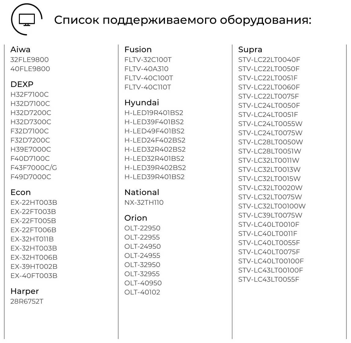 Производитель совместимых устройств : | DEXP, ECON, Fusion, SUPRA, Hyundai, Orion, BQ |