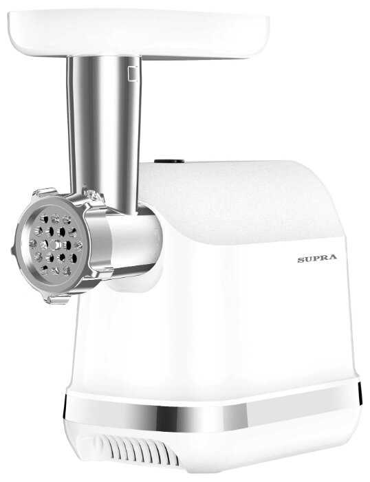 - Включает 2 решетки для фарша (5 и 7 мм), терку и шинковку для овощей, что позволяет готовить драники, салаты и заготовки.