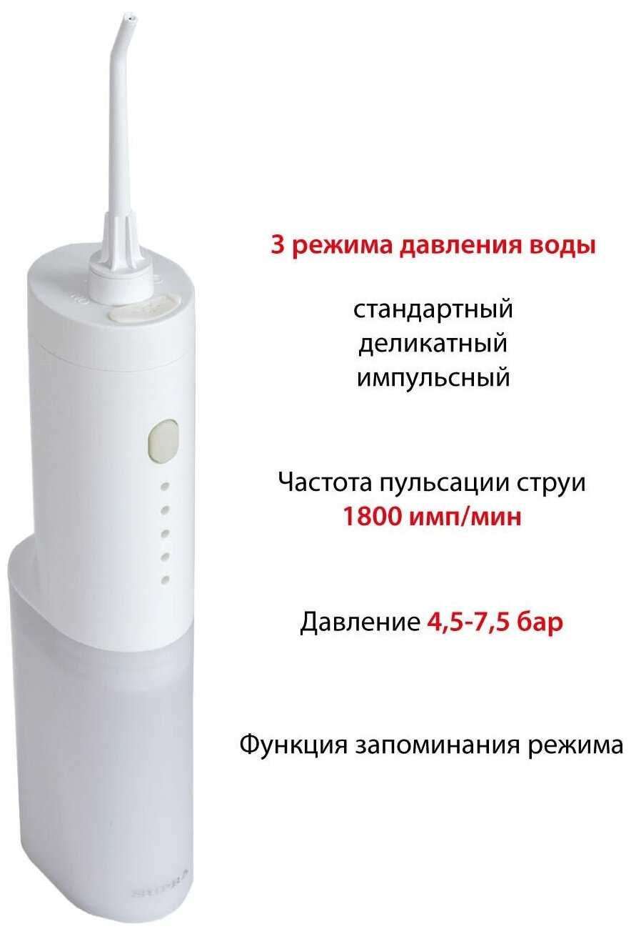 Хорошее дополнение к зубной щетке как дополнительный уход за полостью рта дома или в поездках. Удаляет налет и остатки пищи между зубами и деснами, удобный объём, несколько режимов, только напор немного слабоват и всего две насадки.