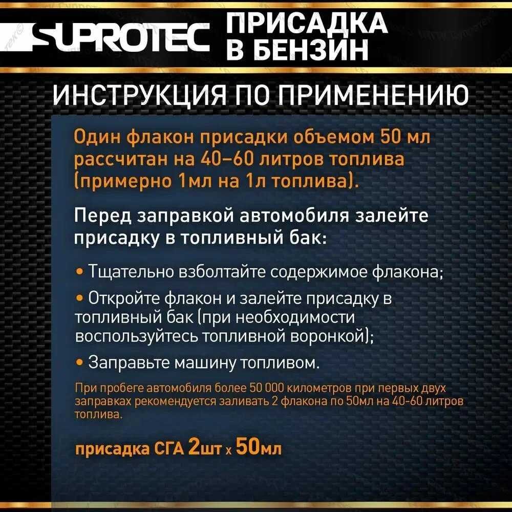 - + постоянно слушаю по радио про супротек,Читал в интернете и все не решался купить но решил попробовать,Купил СГА 2 штуки залил на полный бак -отъездил неделю и процес пошел в лучшую сторону ДВС шепчет форсунки не стучат ,буду еще заливать,