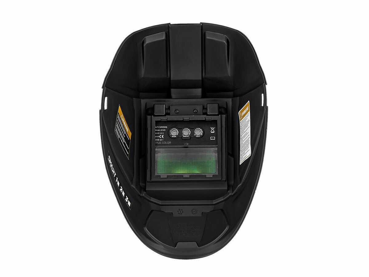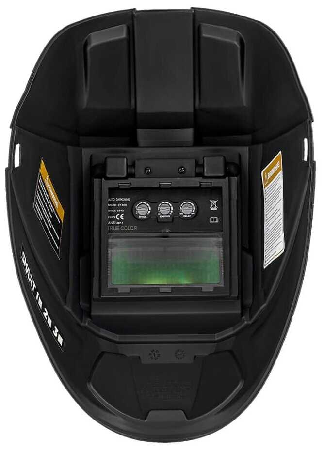 Окошко светофильтра стандартное, но для людей с большой головой может казаться маловатым, вызывая необходимость косить глазами. Пользователи со средним размером головы не жалуются на обзор. В целом, оно достаточное для домашней сварки мелких деталей. -