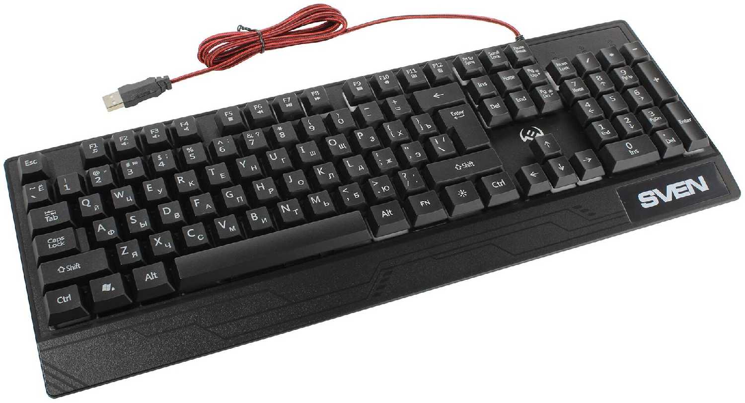 - - Туговатые клавиши, подсветка букв не супер из-за ориола вокруг кнопок, но жить можно. Аляпистая надпись SVEN , белыми большими буквами на черной клавиатуре.