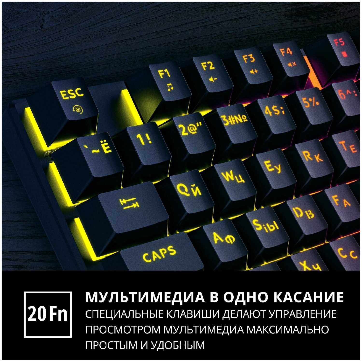 - 104 клавиши, двухэтажный пробел, удлиненные шифты и бэкспейс, не урезано как в TKL-моделях.