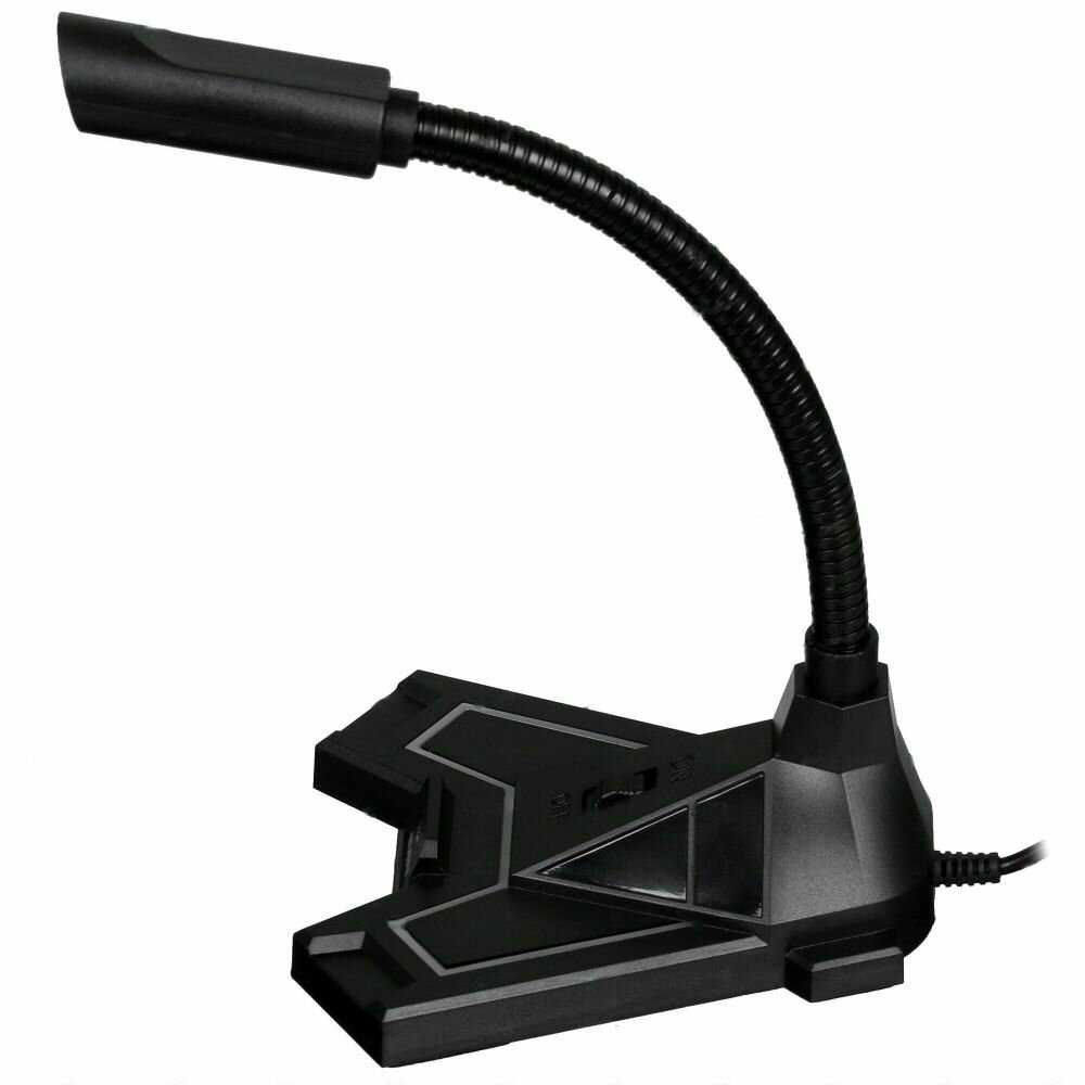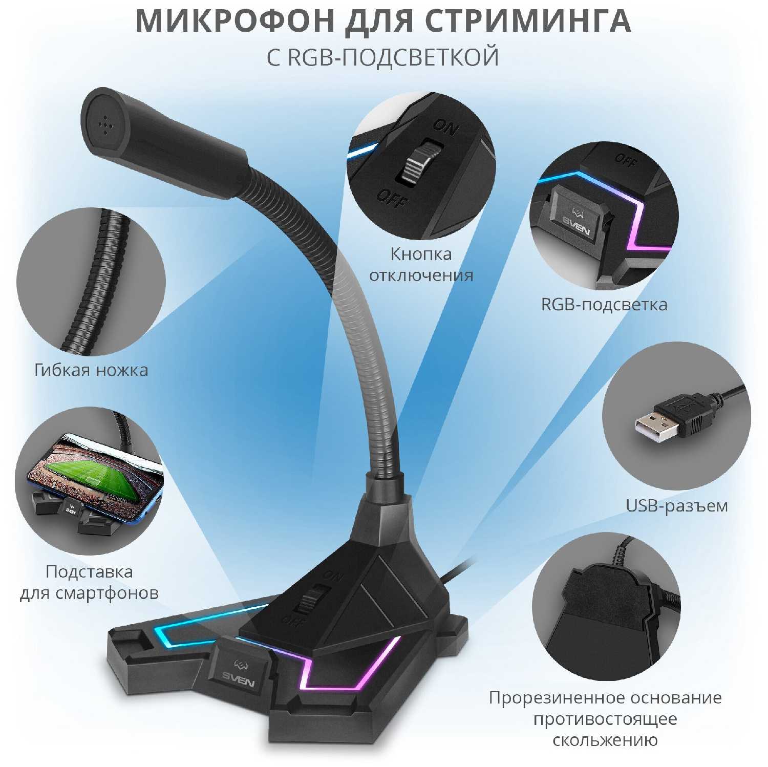 C подсветкой, уверенно стоит на ножке, кикрофон может гнуться без повреждений во все стороны.