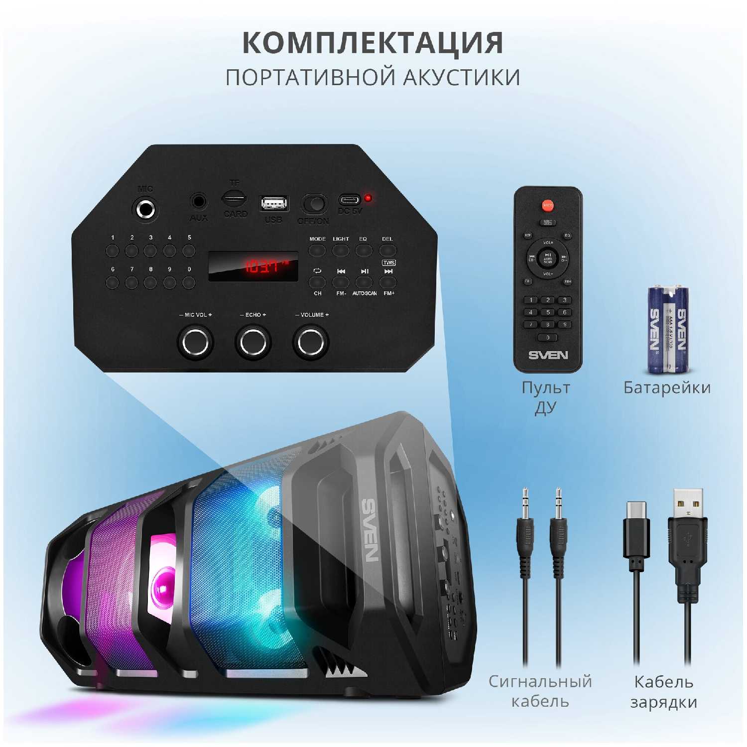 Хотел себе сделать подарок, изначально планировал саундбар, чтобы звук с ТВ нормальный был. Дома несколько маленьких китайских беспроводных колонок, поэтому беспроводное я не рассматривал. Бюджет был в пределах 10, посмотрел и послушал я саундбары в этом ценовом сегменте и не впечатлился, там бюджет по больше надо. Отложил вопрос, потом поехал на дачу к другу и увидел у него этот Sven, понравилось, решил присмотреться. Почитав отзывы окончательно надумал. И если рассматривать только как колонку эту модель, то у меня претензий не много: нет индикатора уровня заряда, зарядка достаточно долгая и только от micro-USB, нет возможности работы от сети кроме как через ЗУ от телефона (а по моим наблюдениям на полную громкость колонка играет часов 5, а заряжается часов 7, т.е. даже будучи на зарядке, колонка может разрядиться). В остальном я доволен полностью, особенно звучанием, за лето 2020 где эта колонка только не побывала, и громкости хватает на дискотеку в кругу друзей, в остальном на максимум и не выкручивал, а если колонка играет не на полную, то играет очень долго, реально на даче комфортный уровень громкости радио на улице, чтобы не долбило, и на всем участке слышно было - играло весь день, на ночь на зарядку. Колонка достаточно массивная, нет влагозащиты, зато динамики нормального размера, и есть нормальный бас, в отличие от компактных мощных колонок. Возможность установки как стоя, так и на бок, что вполне делает из нее саундбар, только вот кроме AUX, выходов больше нет, а в моей 50-дюймовой LG есть только оптический выход, поэтому пришлось докупать конвертер Optical-Aux за 1100р, и колонка в стационарном положении работает как саундбар. Вот тут появляется самый существенный для меня минус - это отсутствие пульта ДУ! Если по блютуз можно самим телефоном громкость +- делать, или хоть смарт часами, то при подключении к телевизору приходится отрывать задницу, т.к. через оптический сигнал громкость не меняется. Функцию караоке с микрофоном так ни разу и не испробовал, но вот электрогитару подключаю постоянно, через гитарный процессор в AUX, ставлю басс -2, и вуаля, прекрасно громко играет и ничего не забивает. Для дома громкости тоже хватает, зал 18м на полностью не выкручиваю, нет необходимости))) Так что если подытожить, то колонка хорошая, рекомендую.