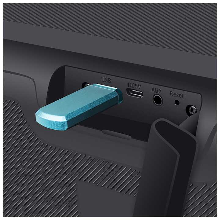 - Колонка корректно работает с флешками до 64 ГБ, распознаёт все популярные аудиоформаты.