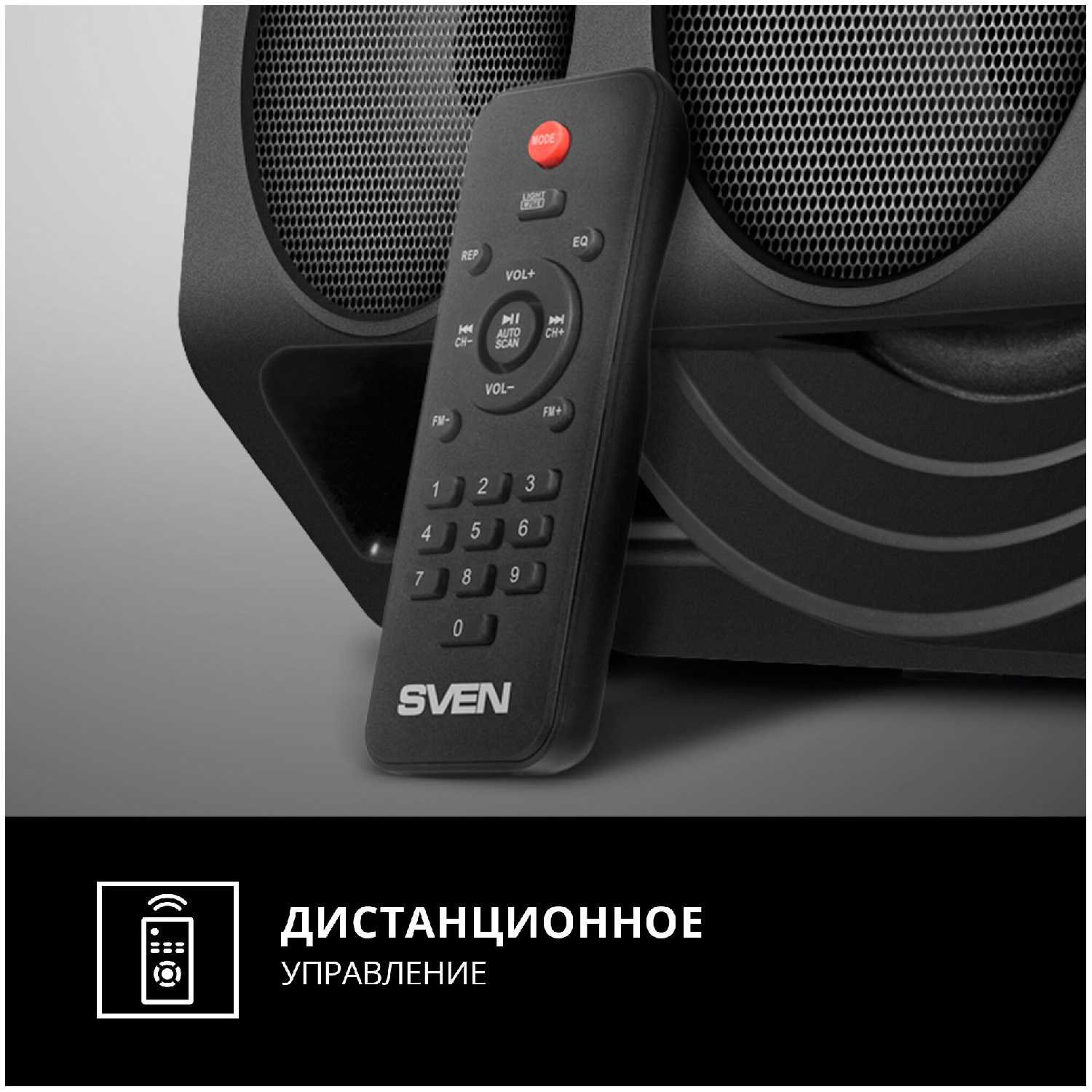 Управление осуществляется кнопками на корпусе, включая отдельные регуляторы громкости, эквалайзера и режимов подсветки. Отсутствие пульта ДУ усложняет использование при подключении к ТВ. Пользователи также отмечают, что цифровые кнопки для выбора треков и радиостанций требуют привыкания, особенно при работе с флешкой. -