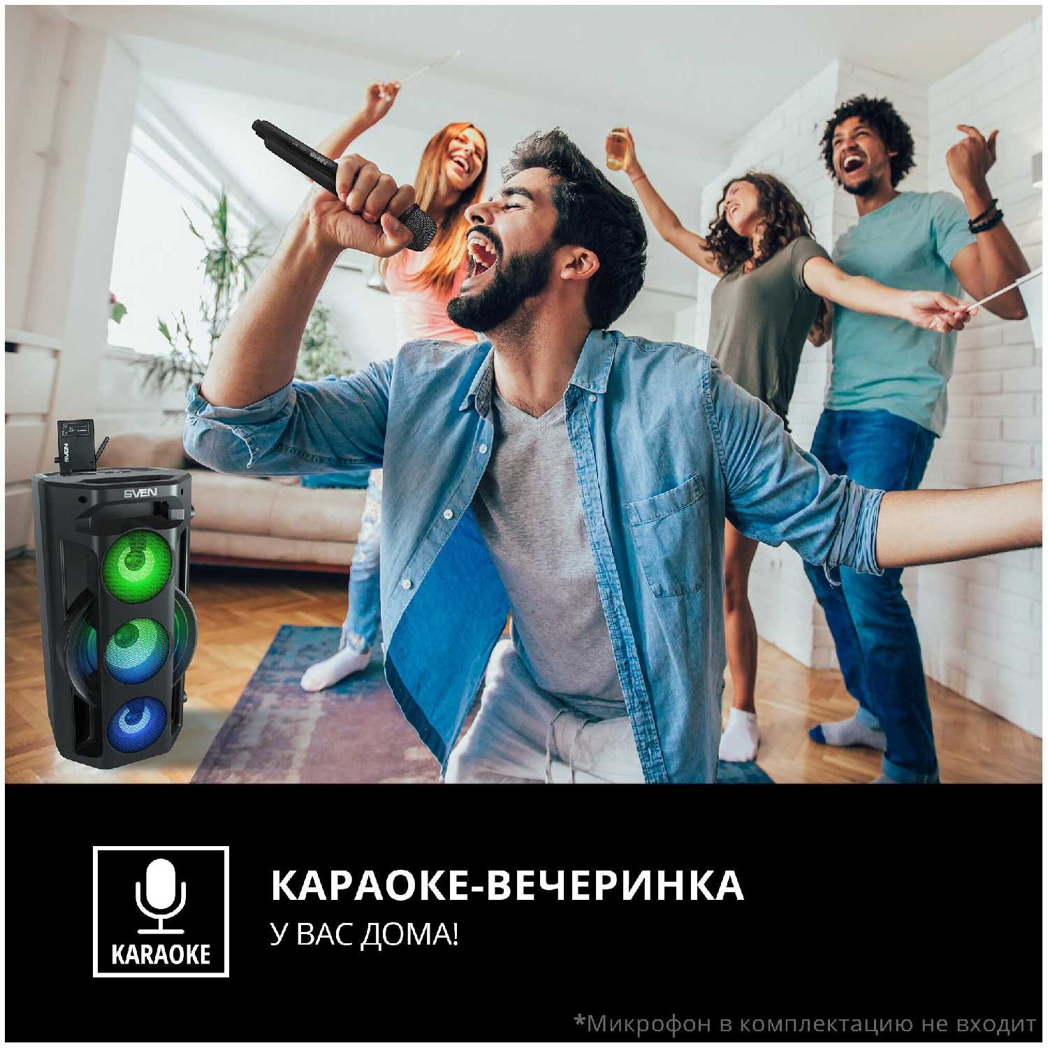 Колонка поддерживает подключение микрофона через отдельный вход, но штатная комплектация его не включает. Пользователи отмечают четкое воспроизведение голоса и возможность регулировки уровня эхо. Для профессионального использования рекомендуется микрофон с предусилителем. -