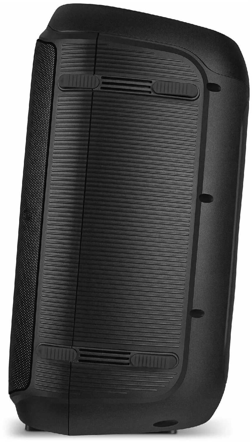 При громкости 100% с подсветкой: 3.5-4 часа. Без подсветки: до 5 часов. В режиме "50% громкость + подсветка" — 5-6 часов. При использовании микрофонов для караоке время автономности сокращается на 40% из-за повышенной нагрузки на усилитель. -