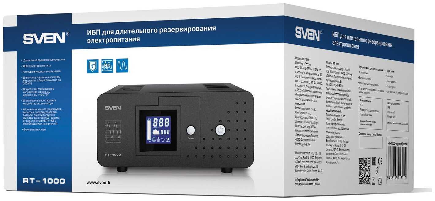 Покупал для резервного питания котла отопления. Все хорошо заработало, порадовал "сквозной" ноль, что важно для фазозависимых котлов. Есть переключатель силы тока зарядки, т.е. можно настроить под свою конкретную батарею. Напряжение при заряде поднимает до 14.65В - это надо учитывать, чтобы подходило для подключаемой батареи. Хорошо бы отразить этот параметр в характеристиках. НО, дальше этот ИБП меня поставил в тупик - после окончания зарядки он ее выключил полностью, а не вошел в "буферный" режим поддержания заряда батареи, как должны делать все ИБП. Т.е. на клеммах было только напряжение самой батареи, которое с каждым днем потихоньку, но уменьшалось, что естественно, т.к. у любой батареи есть саморазряд. Зарядка включается только после переключения с батареи на сеть и при первоначальном подключении к сети... Написал в поддержку Свена на их сайте - в ответ сказали, что это не неисправность, а "компромиссное решение". В чем компромисс - я не понял, но мне такой алгоритм работы зарядки абсолютно не нравится. Бегать с тестером и контролировать уровень оставшегося заряда батареи, чтобы выключить/включить ИБП для включения зарядки, мне совсем "не улыбалось". А иначе с таким алгоритмом есть шанс при отключении сети остаться с полуразряженной батареей... В общем, сдал его назад в магазин, пока не истекли две недели после покупки. Спасибо ребятам в магазине, что без проблем все вернули... Вот такой опыт..
