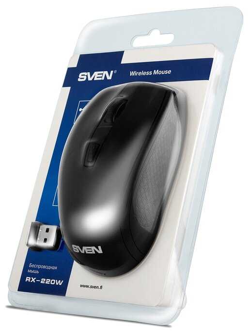 - + Хорошая Беспроводная мышь Sven RX-220W Black (SV-016227). Работает хорошо. Цвет классический черный. Кнопки нажимаются хорошо. Удобно сидит в руке.