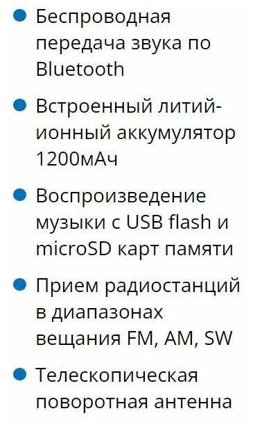 - + Отличный приёмник, хорошо ловит, блютуз, юсб, микросд. Долго держит заряд. Удобная ручка для ношения приёмника.