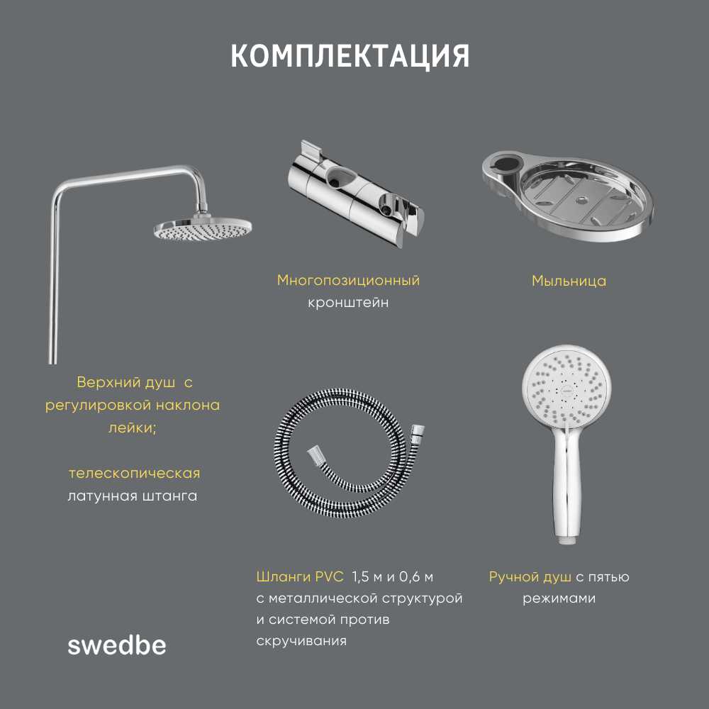 Комплектация : | лейка, шланг, мыльница, верхний душ, душевая стойка, смеситель |