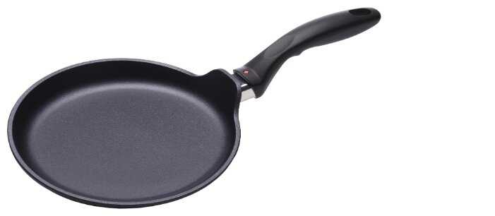 Отличная сковородка для блинов. Не слишком тяжелая, но и не легкая в отличии от своих более дешевых собратьев. Данная модель поддерживает индукцию, поэтому имеет массивное дно для быстрого разогрева. Греется очень быстро, от высокой температуры не изменяет форму - уже проверено. До этого была дешевая блинная сковорода - так от температуры дно выгнулось по центру и из-за этого пришла в негодность. Очень хорошее антипригарное покрытие, к ней ничего не прилипает, хорошая прожарка, быстро набирает температуру. В целом рад покупке, так как половина стоимости была оплачена бонусными рублями.