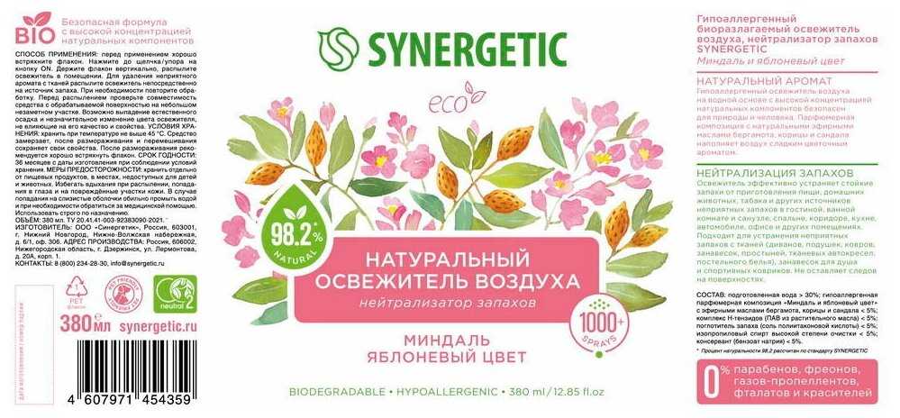 Обзор Synergetic Аэрозоль Миндаль и яблоневый цвет, 380 мл - мнение пользователей*: