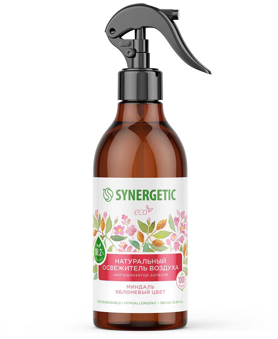 Освежитель воздуха Synergetic «Миндаль и яблоневый цвет» позиционируется как альтернатива традиционным аэрозолям с упором на безопасность и натуральность. Его ключевое преимущество — гипоаллергенная формула, которая не вызывает раздражения дыхательных путей даже при частом использовании. Это подтверждается отзывами пользователей, страдающих от реакций на химические освежители. Состав на водно-спиртовой основе без агрессивных растворителей делает продукт пригодным для обработки текстиля, включая деликатные ткани, что расширяет сферу применения: от освежения штор до устранения затхлости в шкафах.
