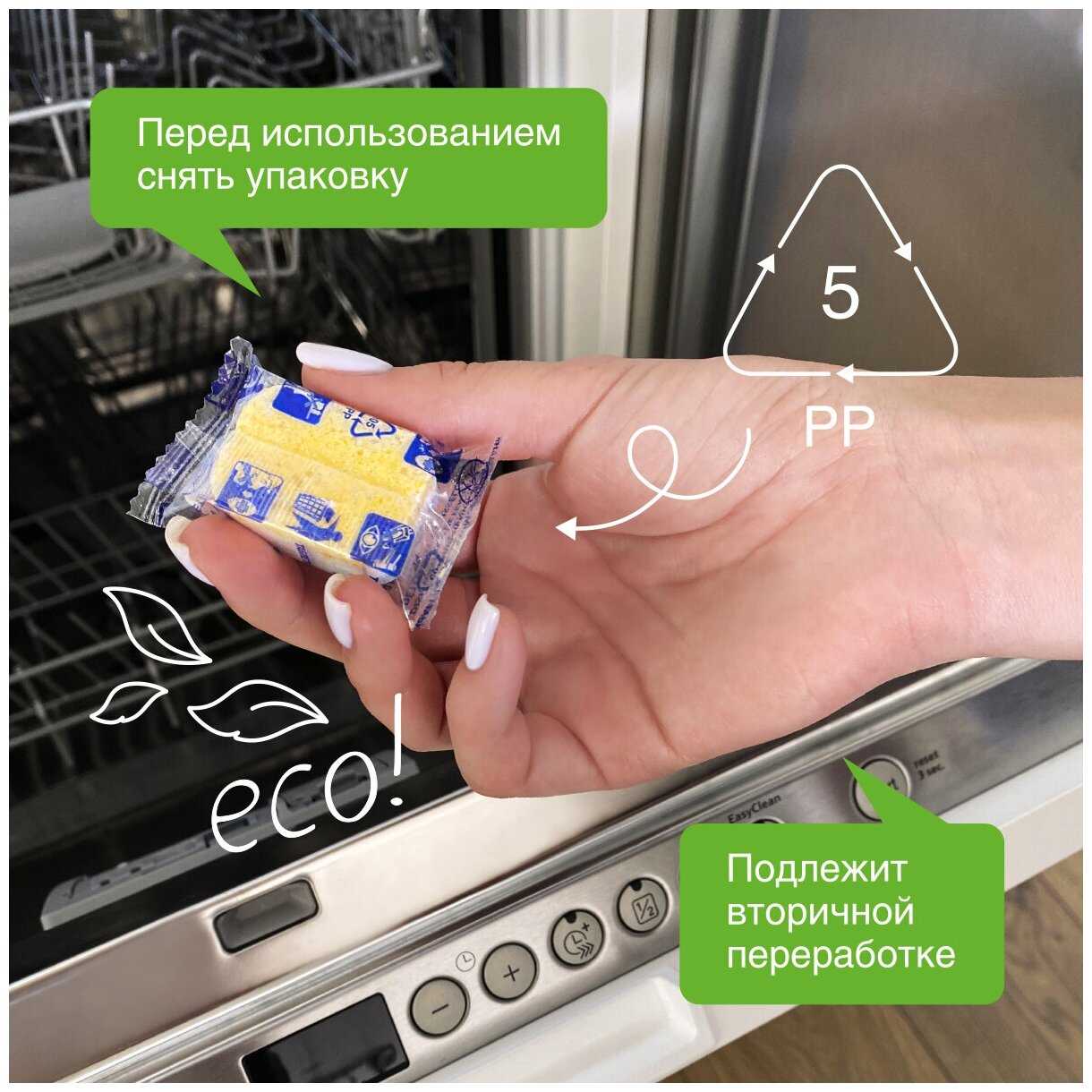 - Пленка таблетки растворяется в воде, исключая контакт с химией при загрузке.