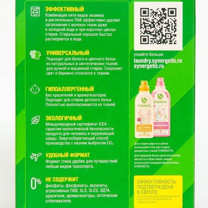 Стиральный порошок Synergetic в стиках получил высокие оценки за удобство дозировки. Пользователи отмечают, что предварительно отмеренные порции исключают риск просыпания, а компактные стики удобно хранить и брать с собой. Особо подчёркивается прочность упаковки: в последних партиях стики стали изготавливать из более плотной бумаги, что снизило риск повреждения даже при длинных ногтях. Формат идеален для тех, кто ценит время — не нужно возиться с мерными стаканами или опасаться перерасхода. Однако некоторые отметили, что для небольших загрузок (например, 3–5 кг) лучше делить стик пополам, так как порошок сильно пенится. Также упоминается удобство для дачников и владельцев септиков: биоразлагаемый состав и отсутствие необходимости хранить объёмные упаковки.