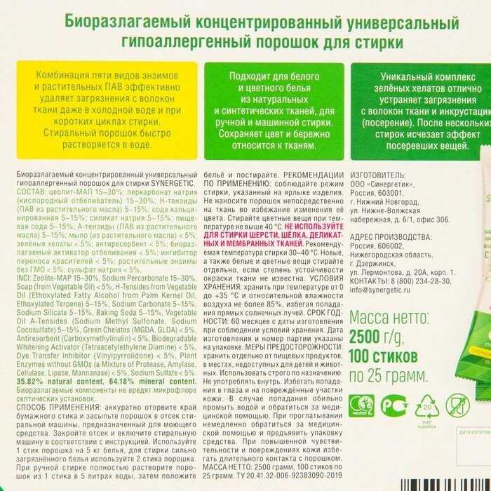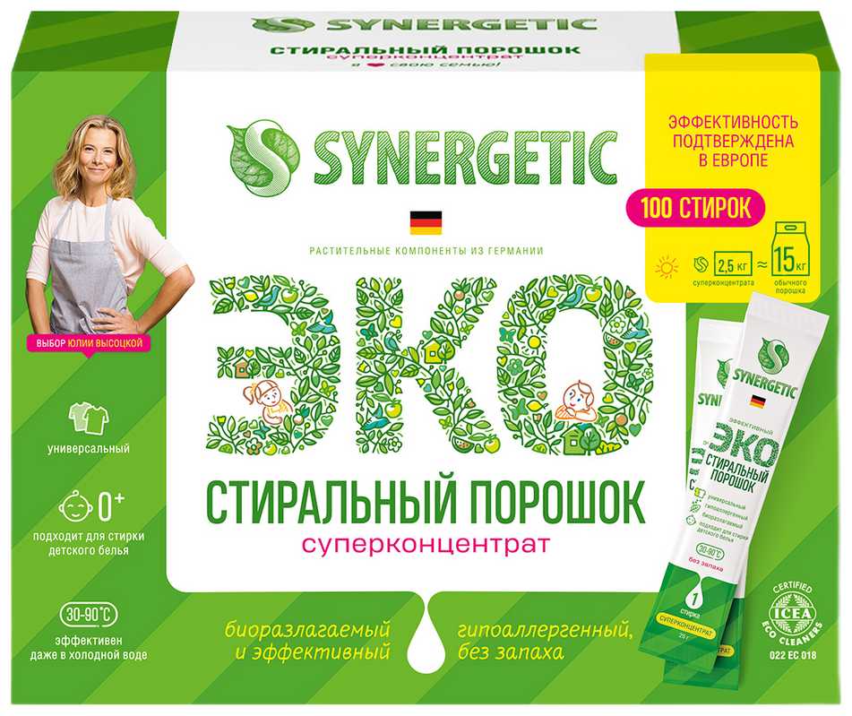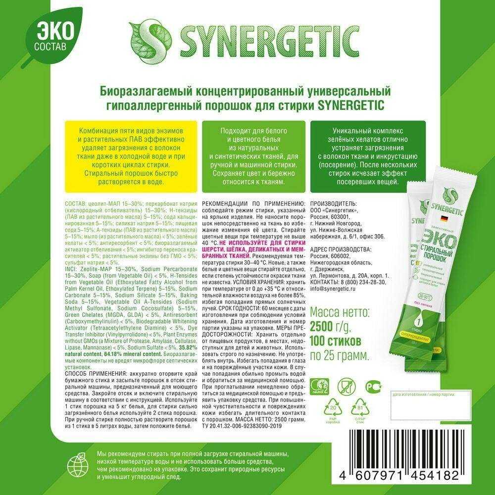 Отзывы свидетельствуют об отличной синергии. Порошок идеально сочетается с кондиционерами, отбеливателями и пятновыводителями бренда. Например, использование порошка с кондиционером Synergetic (около 40 мл на цикл) дает выраженную мягкость белья, а совместное применение с кислородным отбеливателем усиливает эффект возвращения белизны. -