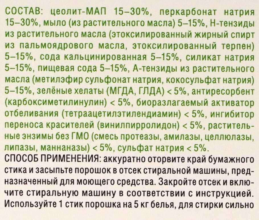 | Состав : | цеолит-МАП 15–30%, перкарбонат натрия 15–30%, мыло (из растительного масла) 5–15%, Н-тензиды из растительного масла (этоксилированный жирный спирт из пальмоядрового масла, этоксилированный терпен) 5–15%, сода кальцинированная 5–15%, силикат натрия 5–15%, пищевая сода 5–15%, А-тензиды из растительного масла (метилэфир сульфонат натрия, кокосульфат натрия) 5-15%, зелёный хелат (МГДА, ГЛДА) < 5%, антиресорбент (карбоксиметилинулин) < 5%, биоразлагаемый активатор отбеливания (тетраацетилэтилендиамин) < 5%, ингибитор переноса красителей (винилпирролидон) < 5%, растительные энзимы без ГМО (смесь протеазы, амилазы, целлюлазы, липазы, маннаназы) < 5%, сульфат натрия < 5% |