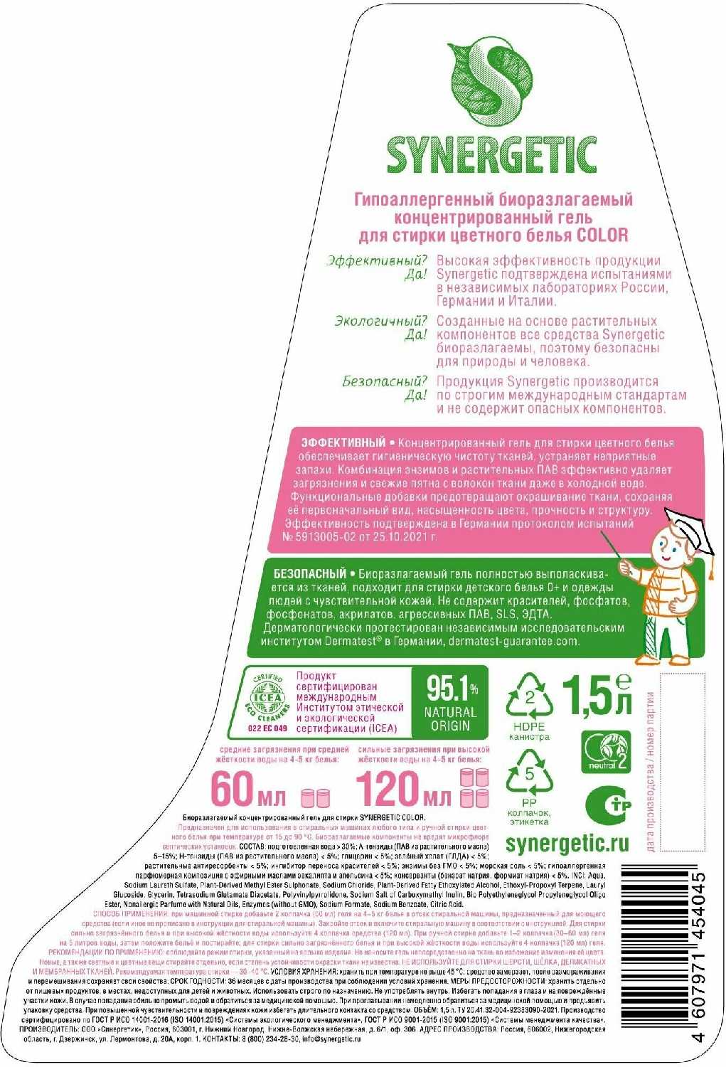 | Состав : | Подготовленная вода > 30%, А-тензиды (ПАВ из растительного масла) 5–15%, Н-тензиды (ПАВ из растительного масла) < 5%, глицерин < 5%, зелёный хелат (ГЛДА) < 5%, растительные антиресорбенты < 5%, ингибитор переноса красителей < 5%, энзимы без ГМО < 5%, морская соль < 5%, гипоаллергенная парфюмерная композиция с эфирными маслами эвкалипта и апельсина < 5%, консерванты (бензоат натрия формиат натрия) < 5%. |