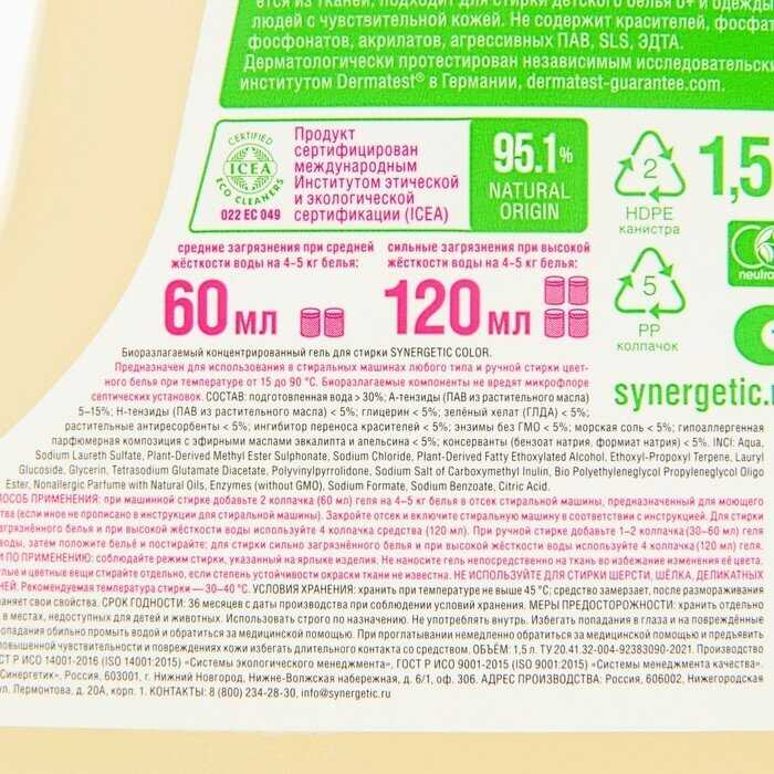 | Особенности : | антибактериальное, безопасно для детей, биоразлагаемое, гипоаллергенное, концентрат, можно использовать без перчаток, подходит для чувствительной кожи, стирка при любой температуре |