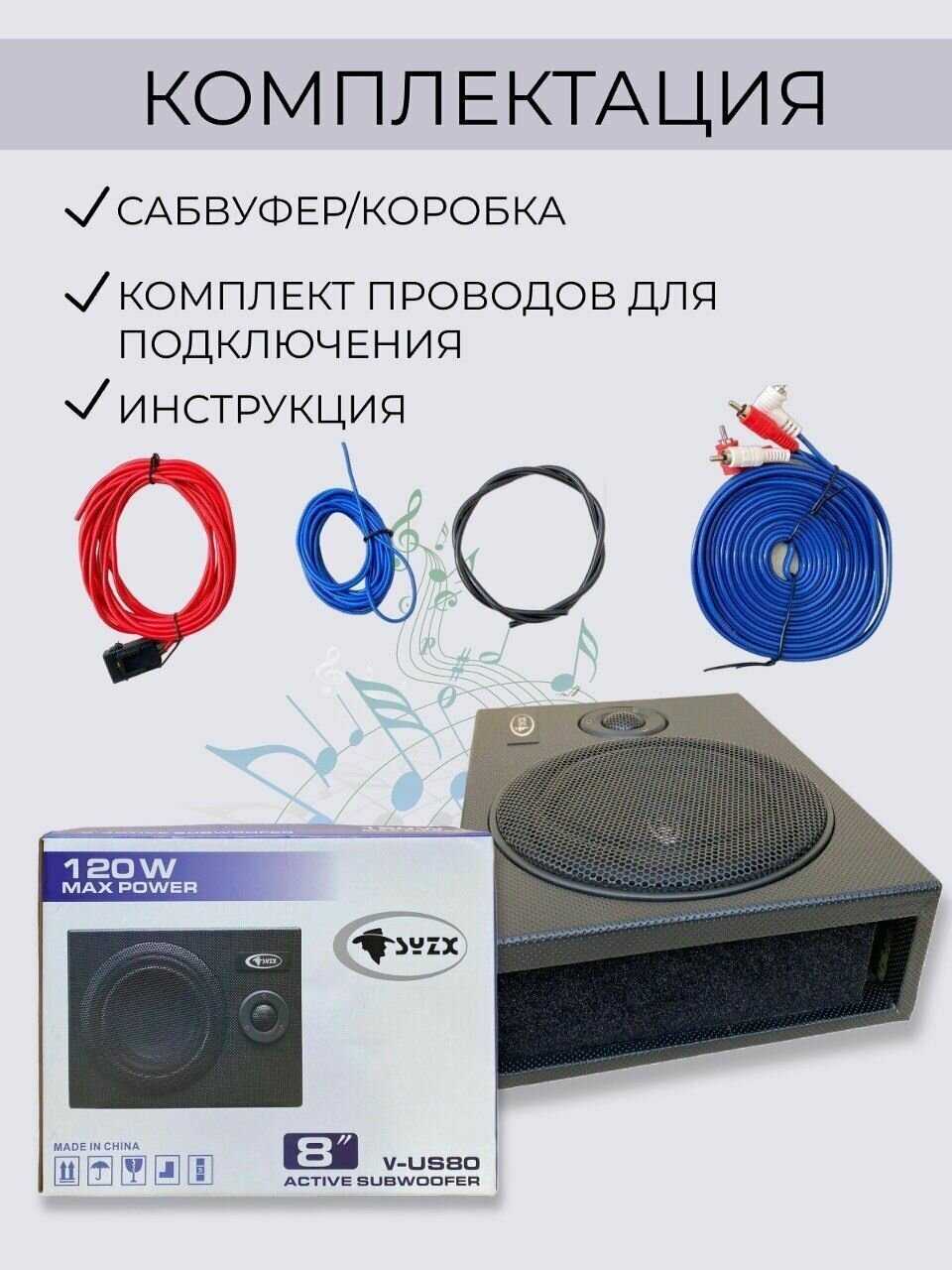 | Комплектация : | Активный Автомобильный сабвуфер syzx V-US80 под сиденье и провода для подключения |