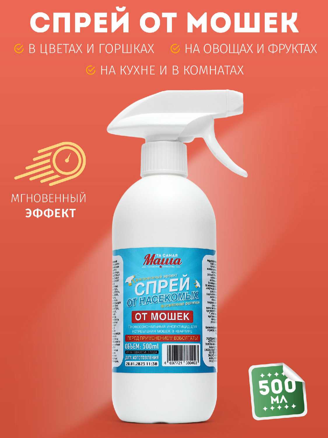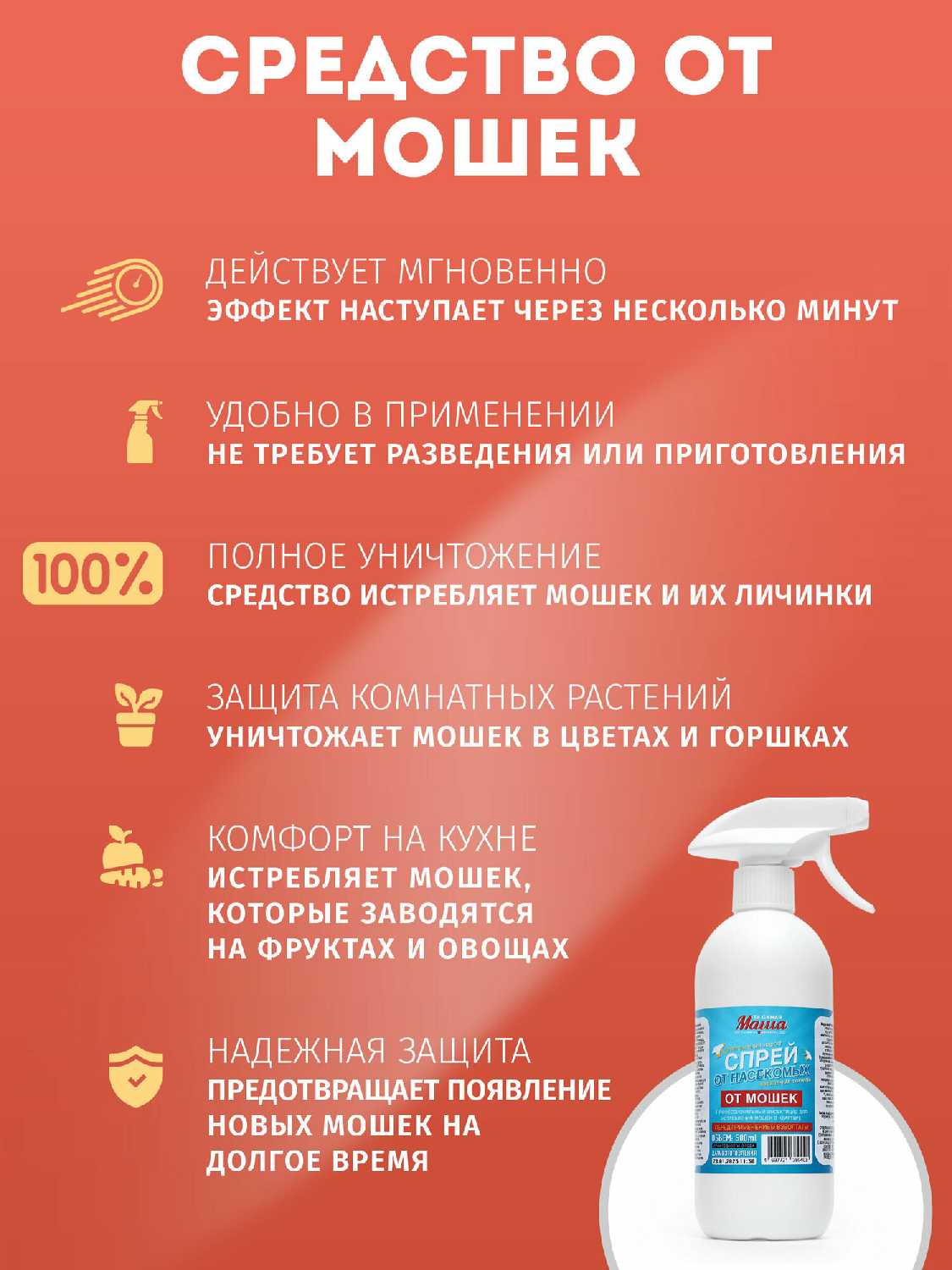 Завелись мошки в цветочном горшке. Сначала пыталась вывести их натуральным био-спреем, но безуспешно. Купила в итоге этот спрей и не пожалела, мошки исчезли после первой же обработки.
