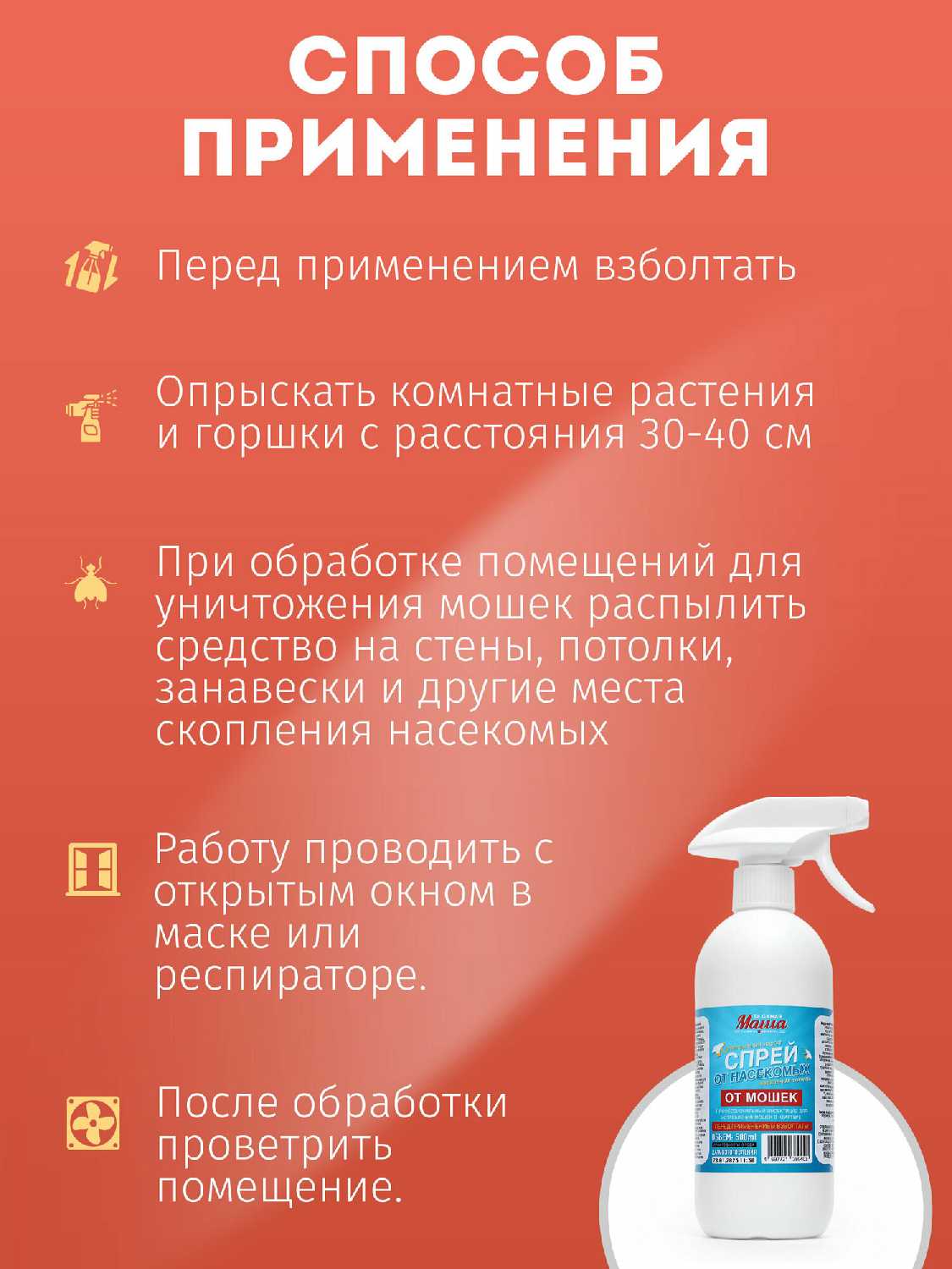 | Способ применения : | Перед применением взболтать. Опрыскать комнатные растения и горшки с расстояния 30-40 сантиметров. При обработке помещений для уничтожения мошек распылить средство на стены, потолки, занавески и другие места скопления насекомых. Работу проводить с открытым окном в маске или респираторе. После обработки тщательно проветрить помещение. |