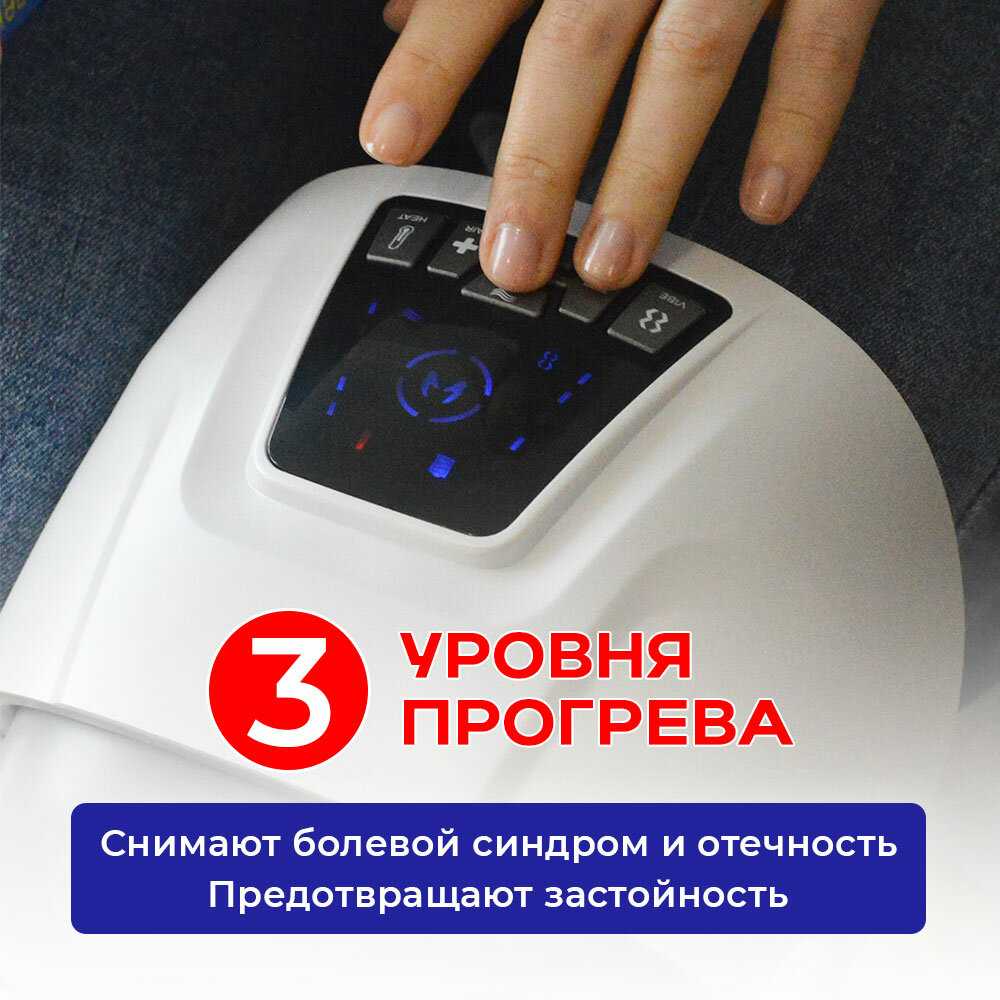 | Дополнительная информация : | Кнопка питания. - Для включения массажера для колена нажмите и удерживайте кнопку питания. - По умолчанию изделие работает в режиме низкой интенсивности с включенным нагревом. Кнопка нагрева. - Нажмите на кнопку нагрева, чтобы включить нагрев. - Режим по умолчанию запускается при самом низком уровне температуры. - Нажмите на кнопку несколько раз для переключения между уровнями температуры. Кнопка остановки/запуска. Нажмите кнопку остановки/запуска, чтобы остановить/запустить функцию сжатия воздуха. Воздух + (Air +) и Воздух - (Air -). - Используйте кнопки + и - для увеличения и уменьшения интенсивности сжатия воздуха. Кнопка вибрации. - Нажмите на кнопку вибрации, чтобы включить функцию вибрации. - Нажмите на кнопку несколько раз для переключения между тремя уровнями интенсивности. Индикатор заряда батареи. - Индикаторы отображают уровень заряда батареи. - При низком заряде батареи последний мигает последний блок. - Индикатор становится красным во время зарядки и зеленым после полной зарядки. 1 Заряжайте массажер с помощью прилагаемого кабеля питания. 2 Во время зарядки индикатор батареи на дисплее горит красным. 3 После полной зарядки цвет индикатора батареи изменится с красного на зеленый. 4. Если индикатор батареи мигает красным во время использования массажера, прекратите использование и зарядите массажер. |