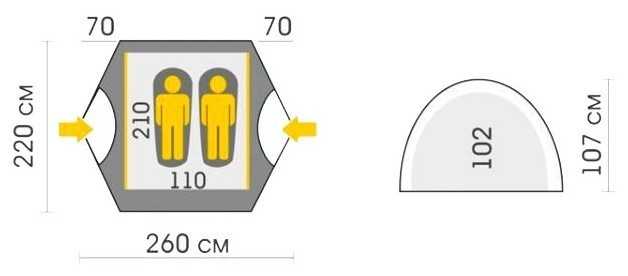 Добротная палатка, швы проклеены, собирается быстро. Комфортно для одного. Туристическая раскладушка 190 влазит только на этапе установки палатки.