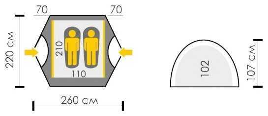 - + лёгкая, алюминиевые дуги,качество соответствует ожиданиям.много карманов.Для двоих не широких в кости максимум.